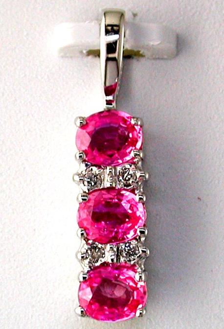 14KT WHITE GOLD FLOATING PENDANT. 3D PAST PRESENT FUTURE DESIGN. ROUND DIAMONDS ARE F/G COLOR, VSSI CLARITY .06 CARATS. AAA OVAL PINK SAPPHIRES ARE 1.30 CARATS. COMES ON A 14KT GOLD DIAMOND CUT 16" INCH CHAIN. WRITTEN APPRAISAL AVAILABLE. COMES IN A PRESENTABLE GIFT BOX.