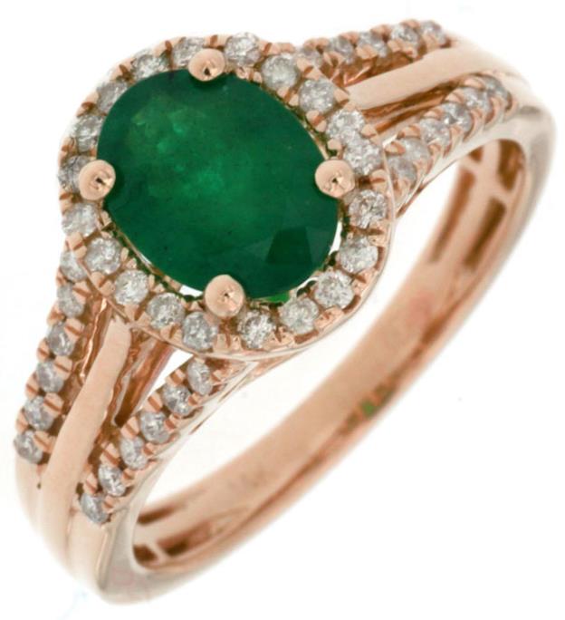 14KT ROSE GOLD ENGAGEMENT RING. 3D HALO CLASSIC DESIGN. ROUND DIAMONDS ARE F/G COLOR, VSSI CLARITY .30 CARATS. AAA OVAL EMERALD IS 1.10 CARATS. RING SIZE 7. CAN BE SIZED BY OUR MASTER JEWELER UPON REQUEST. WRITTEN APPRAISAL AVAILABLE. COMES IN A PRESENTABLE GIFT BOX.