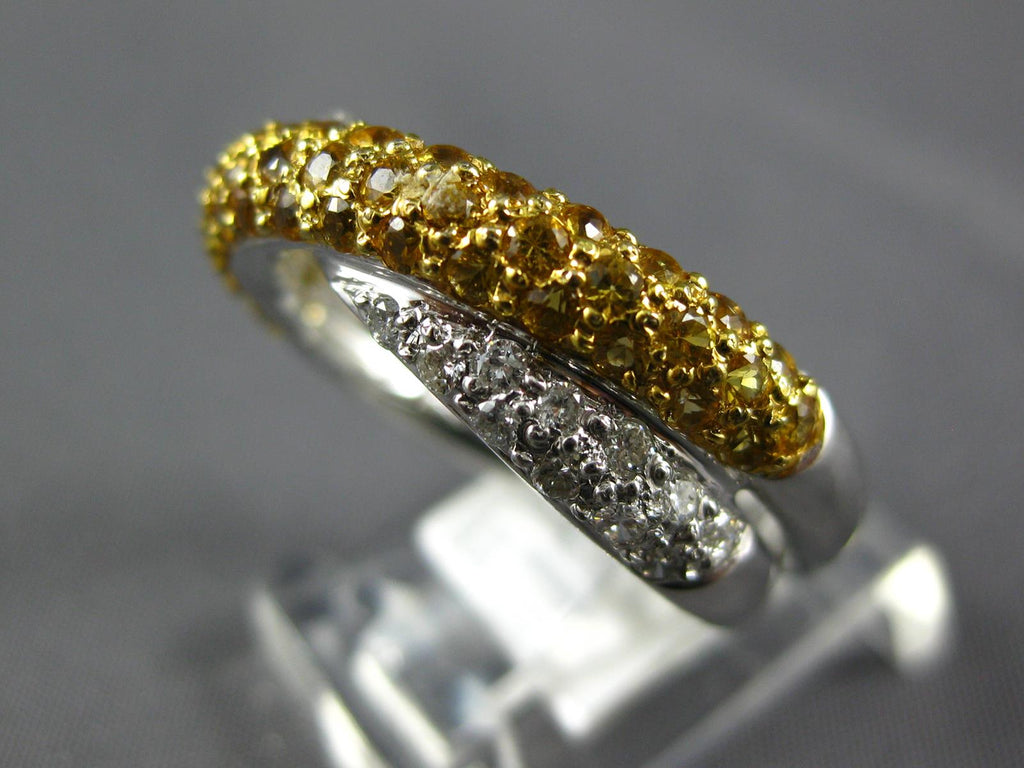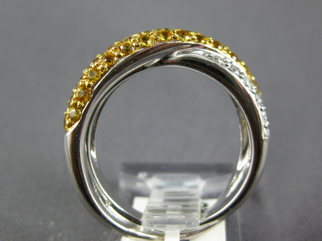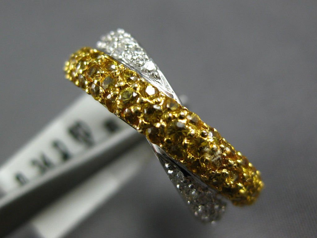 18KT WHITE AND YELLOW GOLD LOVE RING. 3D MULTI ROW CRISS CROSS INFINITY DESIGN. DIAMONDS ARE F/G COLOR, VSSI CLARITY .34 CARATS. AAA YELLOW SAPPHIRES ARE 1.07 CARATS. MEASURES 6.5mm WIDE. RING SIZE 6.75. CAN BE SIZED BY OUR MASTER JEWELER UPON REQUEST. WRITTEN APPRAISAL AVAILABLE. COMES IN A PRESENTABLE GIFT BOX.