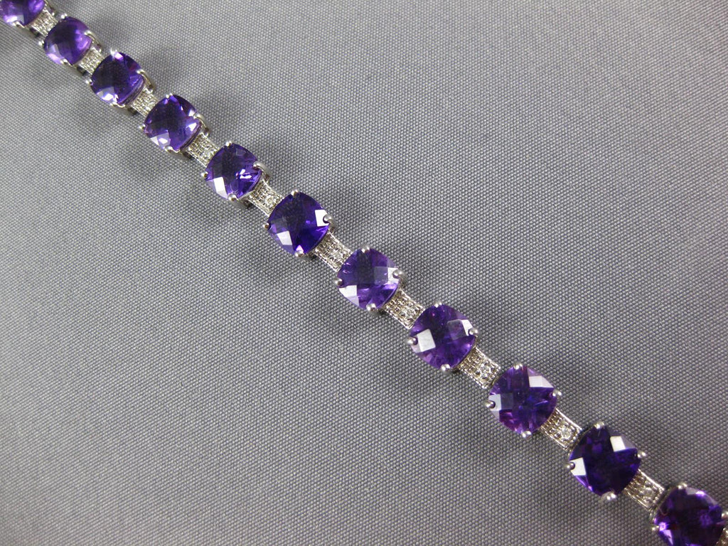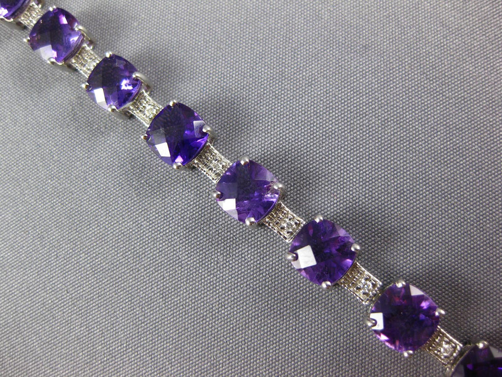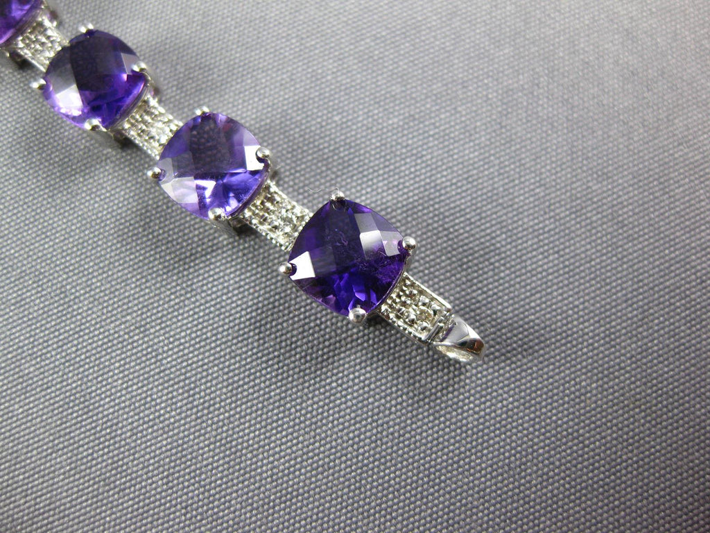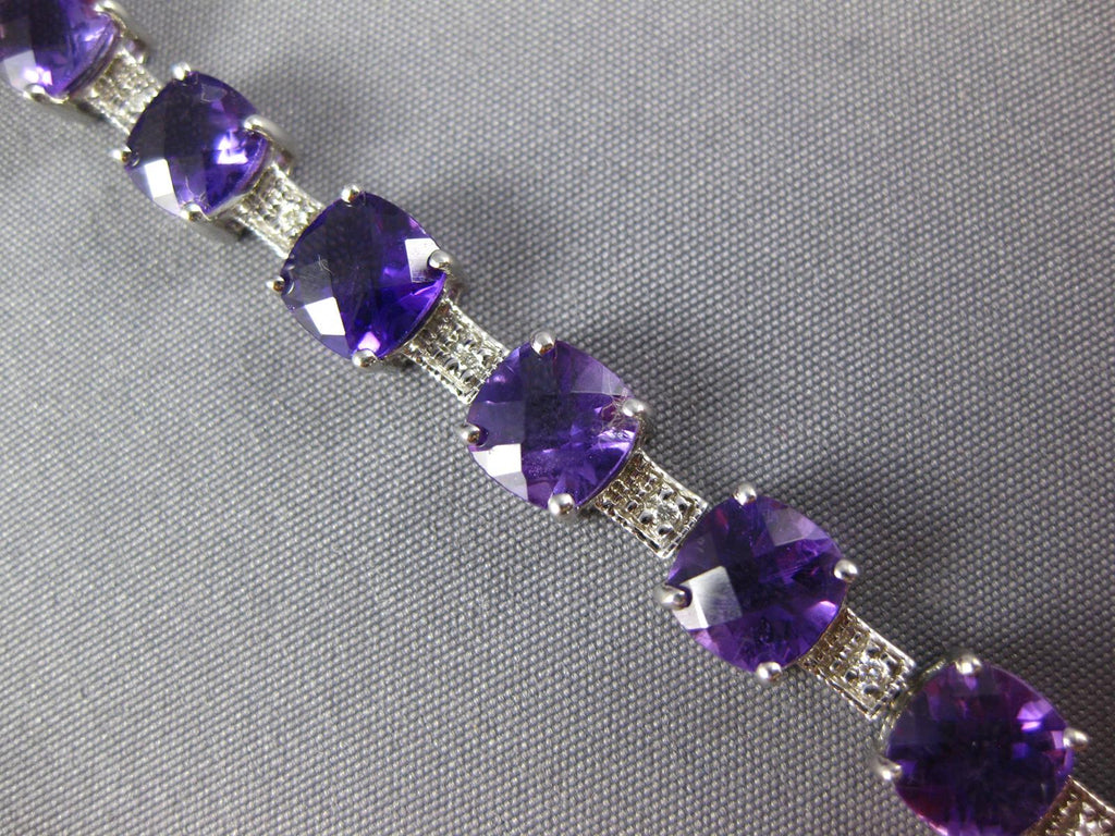 14KT WHITE GOLD TENNIS BRACELET. 3D CLASSIC DESIGN. ROUND DIAMONDS ARE F/G COLOR, VSSI CLARITY .11 CARATS. AAA EXTRA FACETED CUSHION CUT AMETHYSTS ARE 14.10 CARATS. MEASURES 6mm WIDE. 7" INCHES LONG. WRITTEN APPRAISAL AVAILABLE. COMES IN A PRESENTABLE GIFT BOX.
