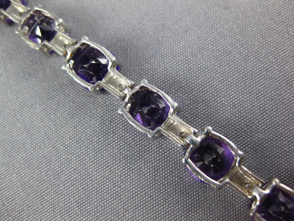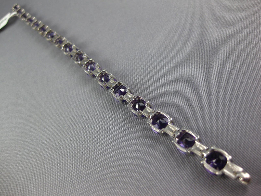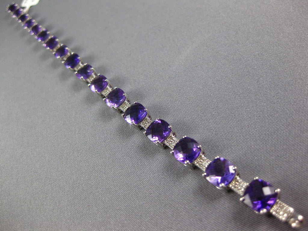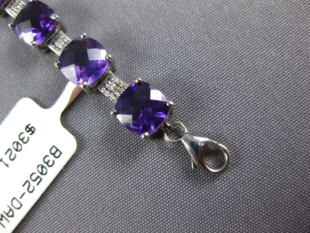 14KT WHITE GOLD TENNIS BRACELET. 3D CLASSIC DESIGN. ROUND DIAMONDS ARE F/G COLOR, VSSI CLARITY .11 CARATS. AAA EXTRA FACETED CUSHION CUT AMETHYSTS ARE 14.10 CARATS. MEASURES 6mm WIDE. 7" INCHES LONG. WRITTEN APPRAISAL AVAILABLE. COMES IN A PRESENTABLE GIFT BOX.