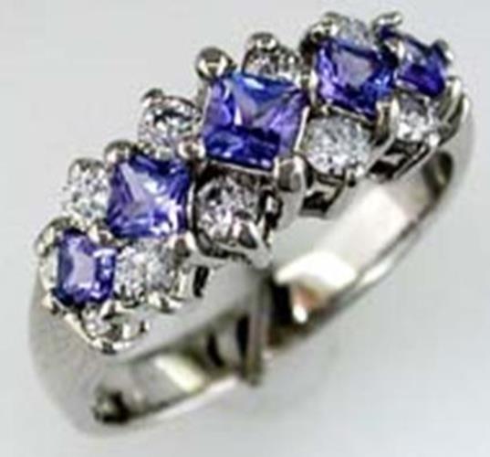 14KT WHITE GOLD ANNIVERSARY RING. 3D CLASSIC DESIGN. ROUND DIAMONDS ARE F/G COLOR, VSSI CLARITY .63 CARATS. AAA PRINCESS CUT TANZANITE ARE .80 CARATS. RING SIZE 7. CAN BE SIZED BY OUR MASTER JEWELER UPON REQUEST. WRITTEN APPRAISAL AVAILABLE. COMES IN A PRESENTABLE GIFT BOX.