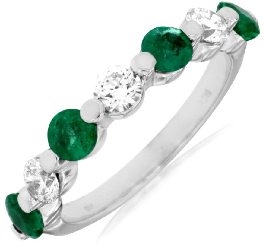 14KT WHITE GOLD ANNIVERSARY RING. 3D CLASSIC SHARE PRONG SEVEN STONE DESIGN. ROUND DIAMONDS ARE F/G COLOR, VSSI CLARITY .60 CARATS. AAA ROUND EMERALDS ARE .85 CARATS. RING SIZE 7. CAN BE SIZED BY OUR MASTER JEWELER UPON REQUEST. WRITTEN APPRAISAL AVAILABLE. COMES IN A PRESENTABLE GIFT BOX.