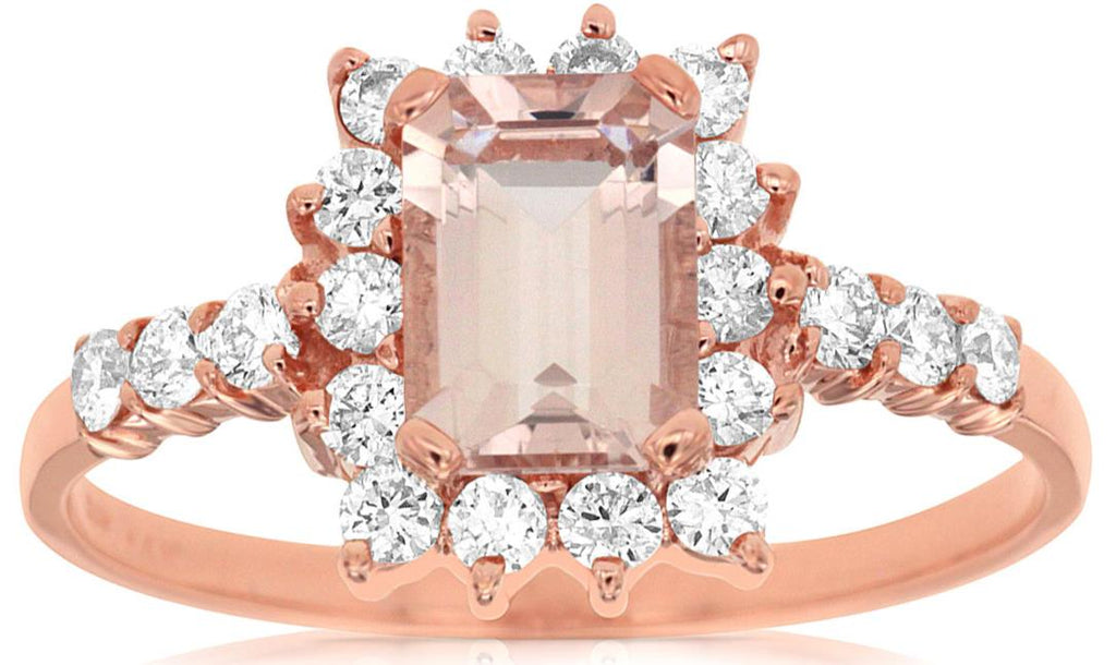 1.45CT DIAMOND & AAA MORGANITE 14K ROSE GOLD EMERALD CUT & ROUND ENGAGEMENT RING