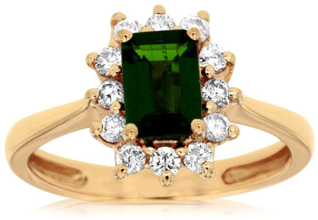 1.4CT DIAMOND & AAA GREEN GARNET 14K YELLOW GOLD EMERALD CUT & ROUND FLOWER RING