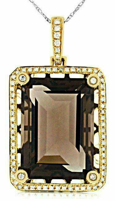 14KT YELLOW GOLD PENDANT. 3D CLASSIC ETOILE SQUARE DESIGN. ROUND DIAMONDS ARE F/G COLOR, VSSI CLARITY .26 CARATS. AAA EMERALD CUT SMOKY TOPAZ IS 15.50 CARATS. COMES ON A 14KT GOLD DIAMOND CUT 16" INCH CHAIN. WRITTEN APPRAISAL AVAILABLE. COMES IN A PRESENTABLE GIFT BOX.