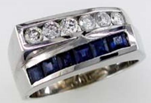 14KT WHITE GOLD FUN RING. 3D CHANNEL DESIGN. ROUND DIAMONDS ARE F/G COLOR, VSSI CLARITY .50 CARATS. AAA BAGUETTE SAPPHIRES ARE 1.0 CARAT. RING SIZE 7. CAN BE SIZED BY OUR MASTER JEWELER UPON REQUEST. WRITTEN APPRAISAL AVAILABLE. COMES IN A PRESENTABLE GIFT BOX.