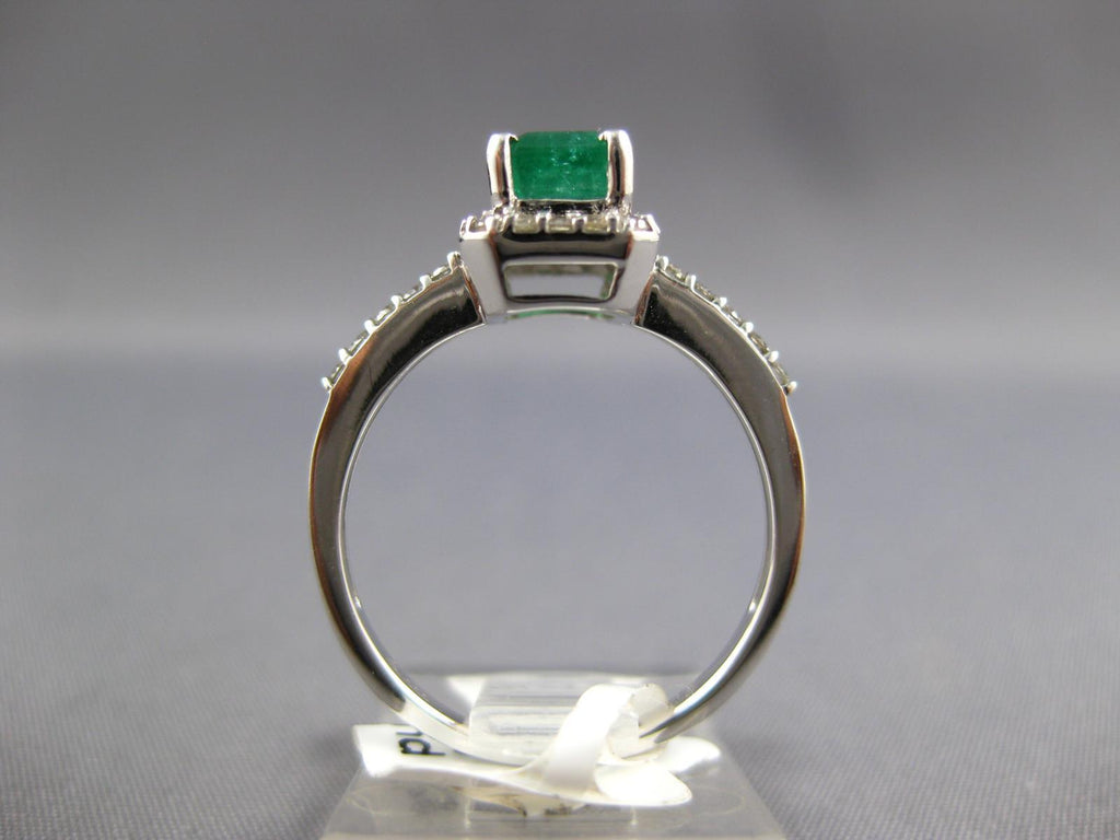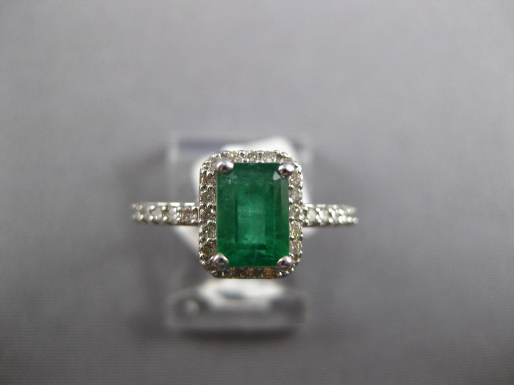 14KT WHITE GOLD ENGAGEMENT RING. 3D CLASSIC HALO DESIGN. ROUND DIAMONDS ARE F/G COLOR, VSSI CLARITY .27 CARATS. AAA EMERALD CUT EMERALD IS 1.25 CARATS. MEASURES 9mm WIDE. RING SIZE 6.25. CAN BE SIZED BY OUR MASTER JEWELER UPON REQUEST. WRITTEN APPRAISAL AVAILABLE. COMES IN A PRESENTABLE GIFT BOX.
