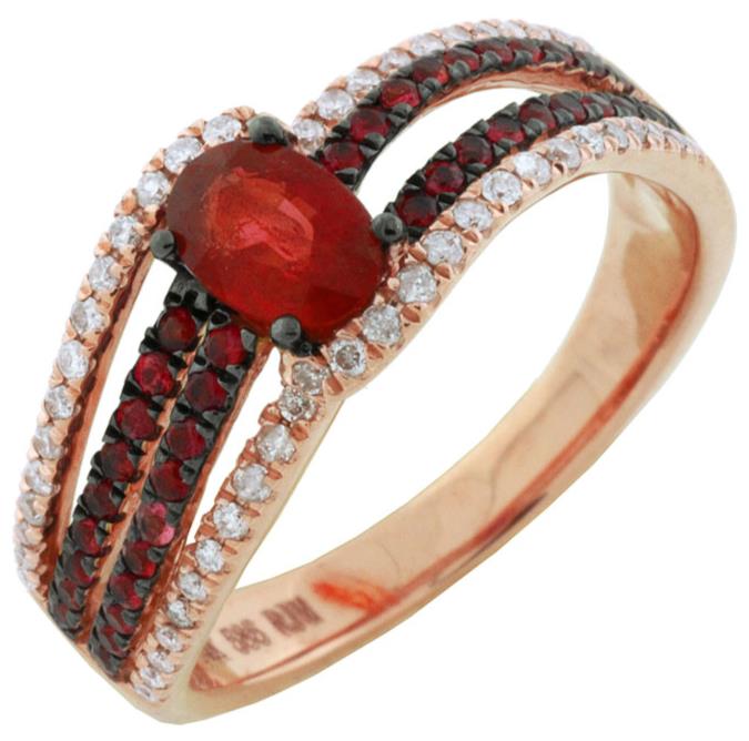 14KT ROSE GOLD FUN RING. 3D MULTI ROW DIAGONAL DESIGN. ROUND DIAMONDS ARE F/G COLOR, VSSI CLARITY .22 CARATS. AAA OVAL RUBIES ARE 1.30 CARATS. RING SIZE 7. CAN BE SIZED BY OUR MASTER JEWELER UPON REQUEST. WRITTEN APPRAISAL AVAILABLE. COMES IN A PRESENTABLE GIFT BOX.