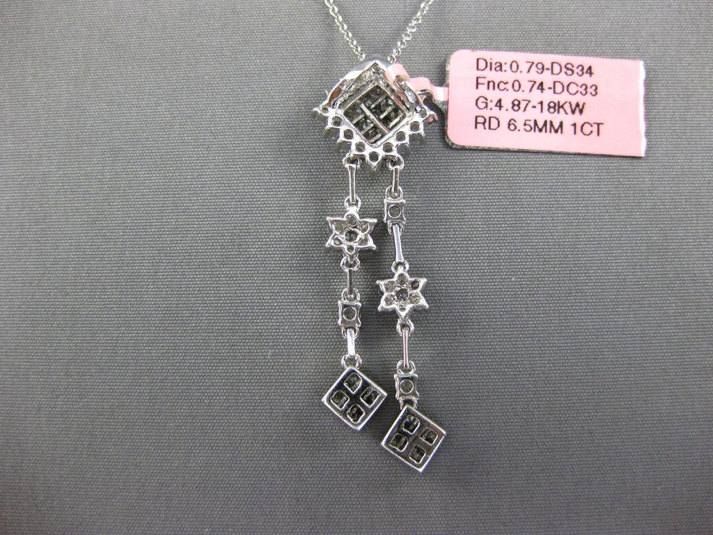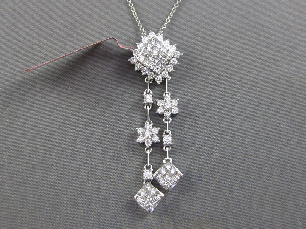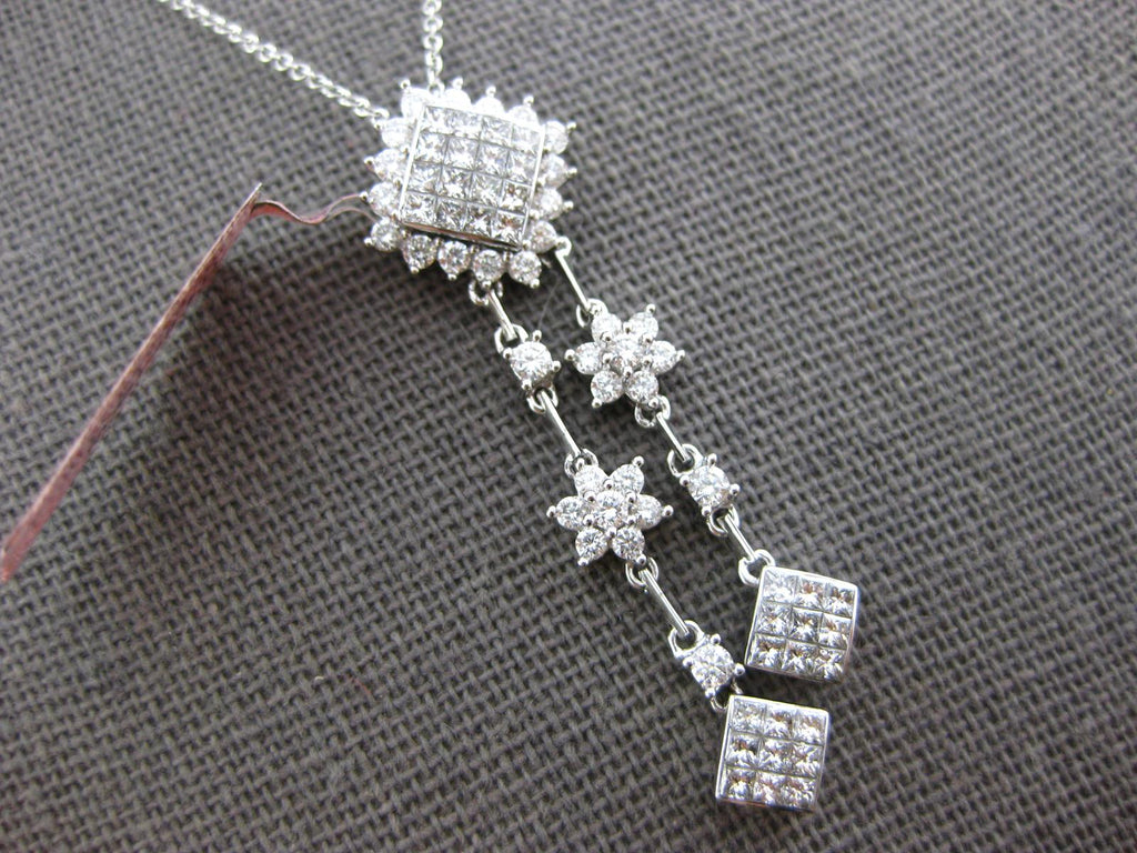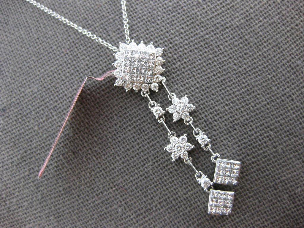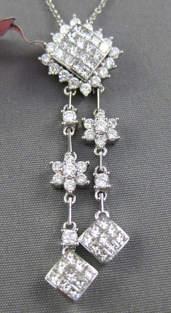 18KT WHITE GOLD FLOATING PENDANT. 3D INVISIBLE FLOWER BY THE YARD LARIAT DESIGN. ROUND AND PRINCESS CUT DIAMONDS ARE F/G COLOR, VS CLARITY 1.53 CARATS. MEASURES 42mm X 13mm. COMES ON A 14KT GOLD DIAMOND CUT 16" INCH CHAIN. WRITTEN APPRAISAL AVAILABLE. COMES IN A PRESENTABLE GIFT BOX.