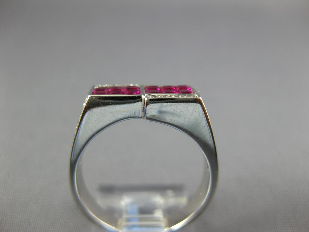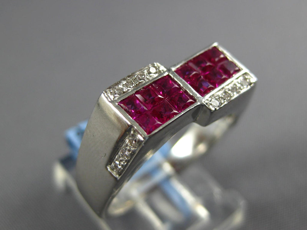 18KT WHITE GOLD FUN RING. 3D INVISIBLE DOUBLE SQUARE DESIGN. ROUND DIAMONDS ARE F/G COLOR, VS CLARITY .09 CARATS. AAA PRINCESS CUT RUBIES ARE 1.45 CARATS. MEASURES 8mm WIDE. RING SIZE 7.75. CAN BE SIZED BY OUR MASTER JEWELER UPON REQUEST. WRITTEN APPRAISAL AVAILABLE. COMES IN A PRESENTABLE GIFT BOX.