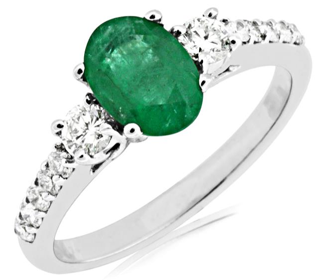 1.55CT DIAMOND & AAA EMERALD 14KT WHITE GOLD OVAL & ROUND 3 STONE PROMISE RING