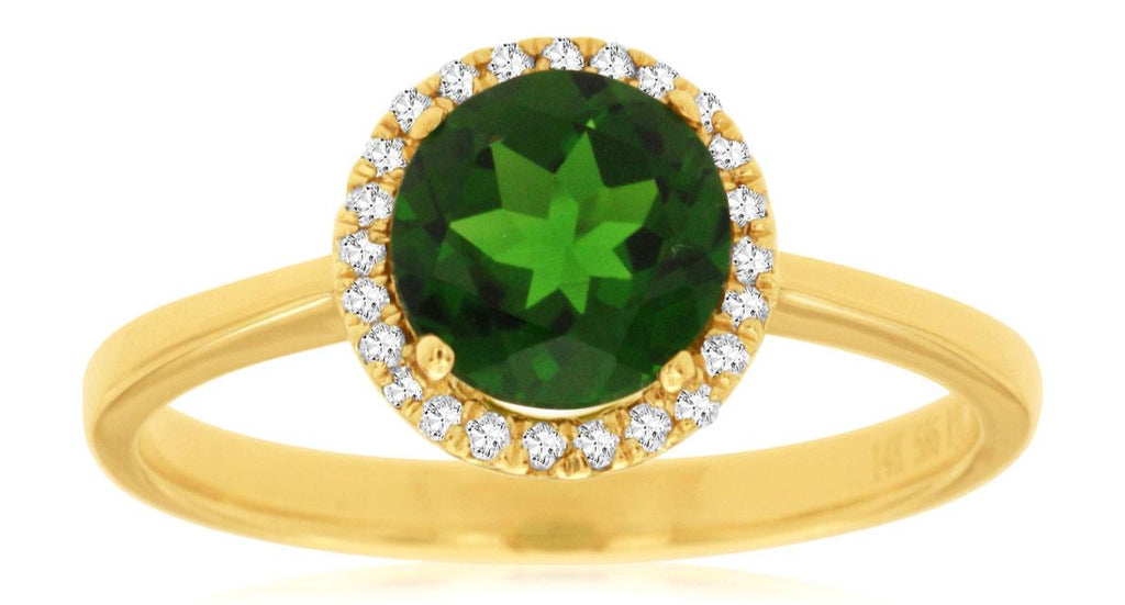 14KT YELLOW GOLD FRIENDSHIP LOVE RING. 3D ROUND HALO CLASSIC DESIGN. DIAMONDS ARE F/G COLOR, VSSI CLARITY .10 CARATS. AAA ROUND GREEN GARNET IS 1.45 CARATS. RING SIZE 7. CAN BE SIZED BY OUR MASTER JEWELER UPON REQUEST. WRITTEN APPRAISAL AVAILABLE. COMES IN A PRESENTABLE GIFT BOX.