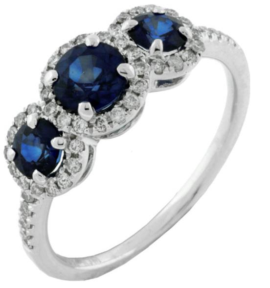 14KT WHITE GOLD ANNIVERSARY RING. 3D THREE STONE HALO CLASSIC PAST PRESENT FUTURE DESIGN. DIAMONDS ARE F/G COLOR, VSSI CLARITY .25 CARATS. AAA ROUND SAPPHIRES ARE 1.30 CARATS. RING SIZE 7. CAN BE SIZED BY OUR MASTER JEWELER UPON REQUEST. WRITTEN APPRAISAL AVAILABLE. COMES IN A PRESENTABLE GIFT BOX.