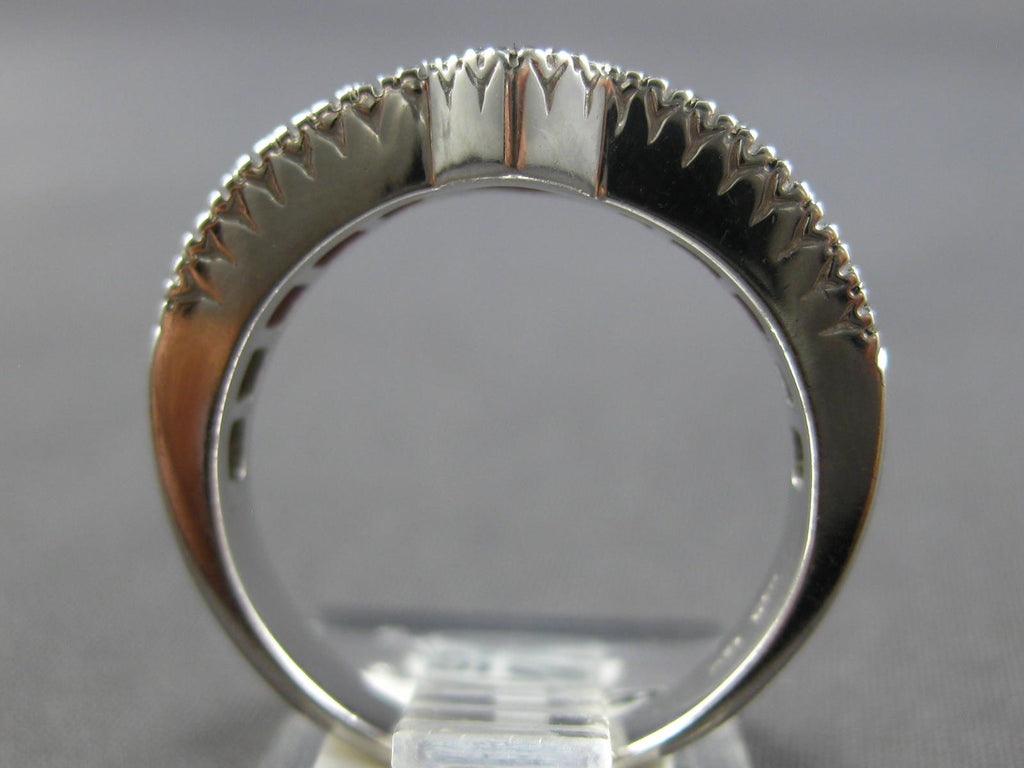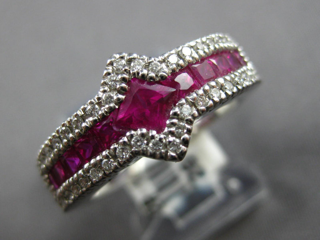 18KT WHITE GOLD FUN RING. 3D DOUBLE V DESIGN. ROUND DIAMONDS ARE F/G COLOR, VSSI CLARITY .31 CARATS. AAA PRINCESS CUT RUBIES ARE 1.26 CARATS. MEASURES 9.5mm WIDE. RING SIZE 7. CAN BE SIZED BY OUR MASTER JEWELER UPON REQUEST. WRITTEN APPRAISAL AVAILABLE. COMES IN A PRESENTABLE GIFT BOX.