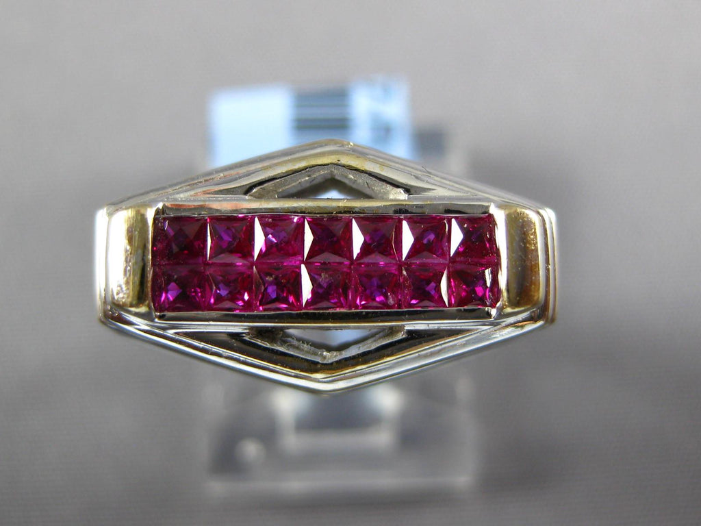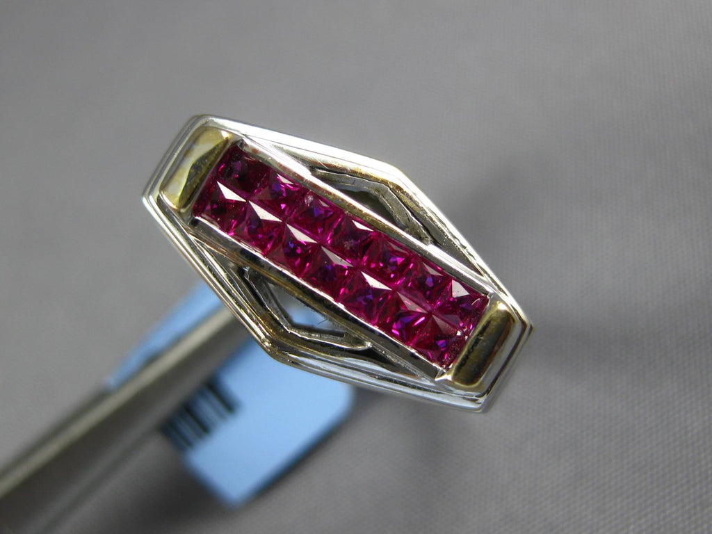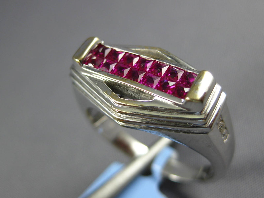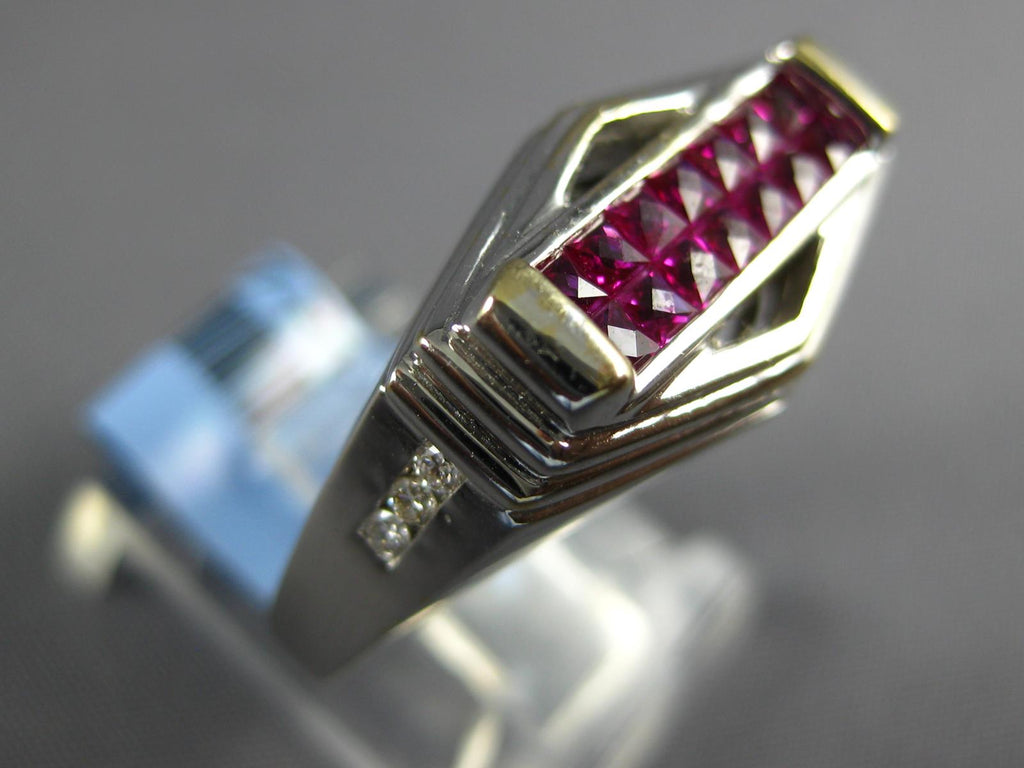 18KT WHITE GOLD FUN RING. 3D INVISIBLE RECTANGULAR DESIGN. ROUND DIAMONDS ARE F/G COLOR, VS CLARITY .08 CARATS. AAA PRINCESS CUT RUBIES ARE 1.50 CARATS. MEASURES 10mm WIDE. RING SIZE 8. CAN BE SIZED BY OUR MASTER JEWELER UPON REQUEST. WRITTEN APPRAISAL AVAILABLE. COMES IN A PRESENTABLE GIFT BOX.