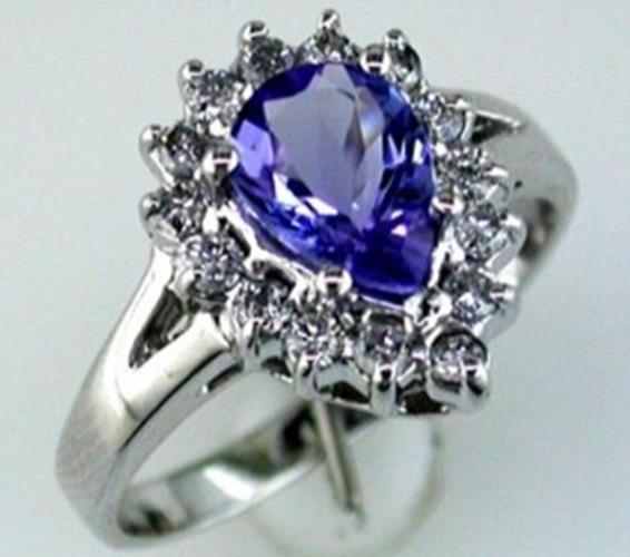 14KT WHITE GOLD FUN RING. 3D CLASSIC DESIGN. ROUND DIAMONDS ARE F/G COLOR, VSSI CLARITY .40 CARATS. AAA PEAR SHAPE TANZANITE IS 1.10 CARATS. RING SIZE 7. CAN BE SIZED BY OUR MASTER JEWELER UPON REQUEST. WRITTEN APPRAISAL AVAILABLE. COMES IN A PRESENTABLE GIFT BOX.