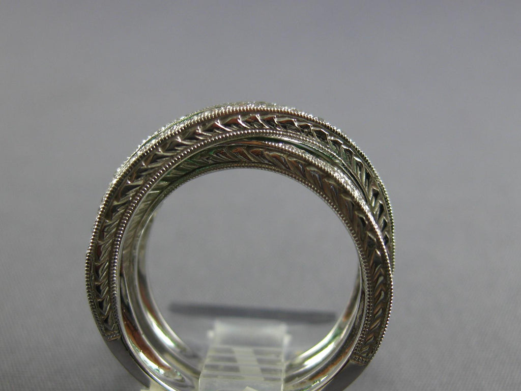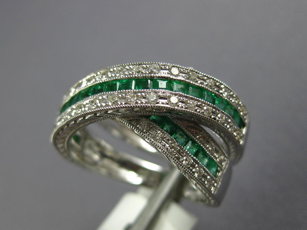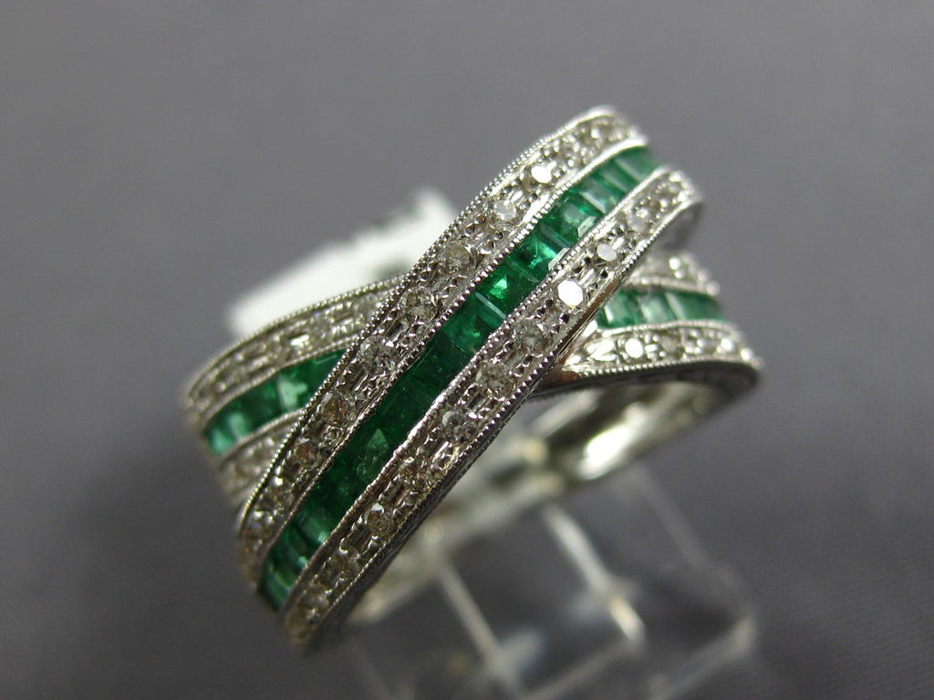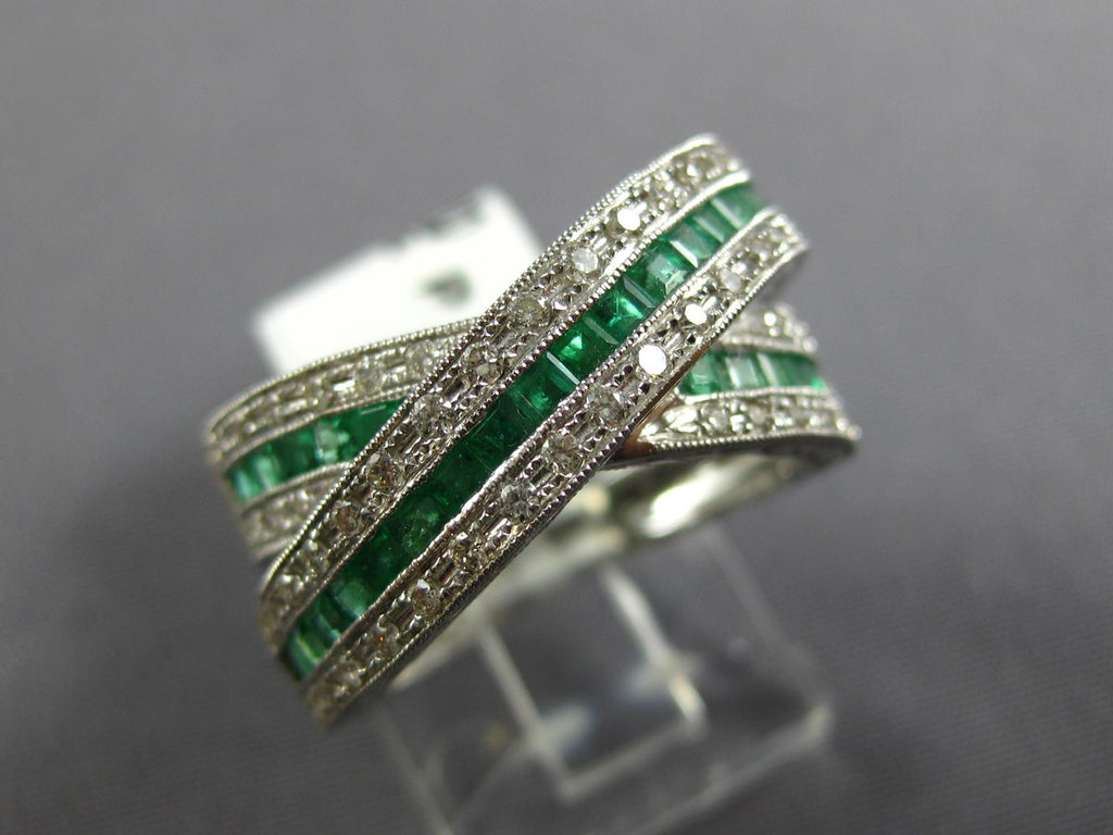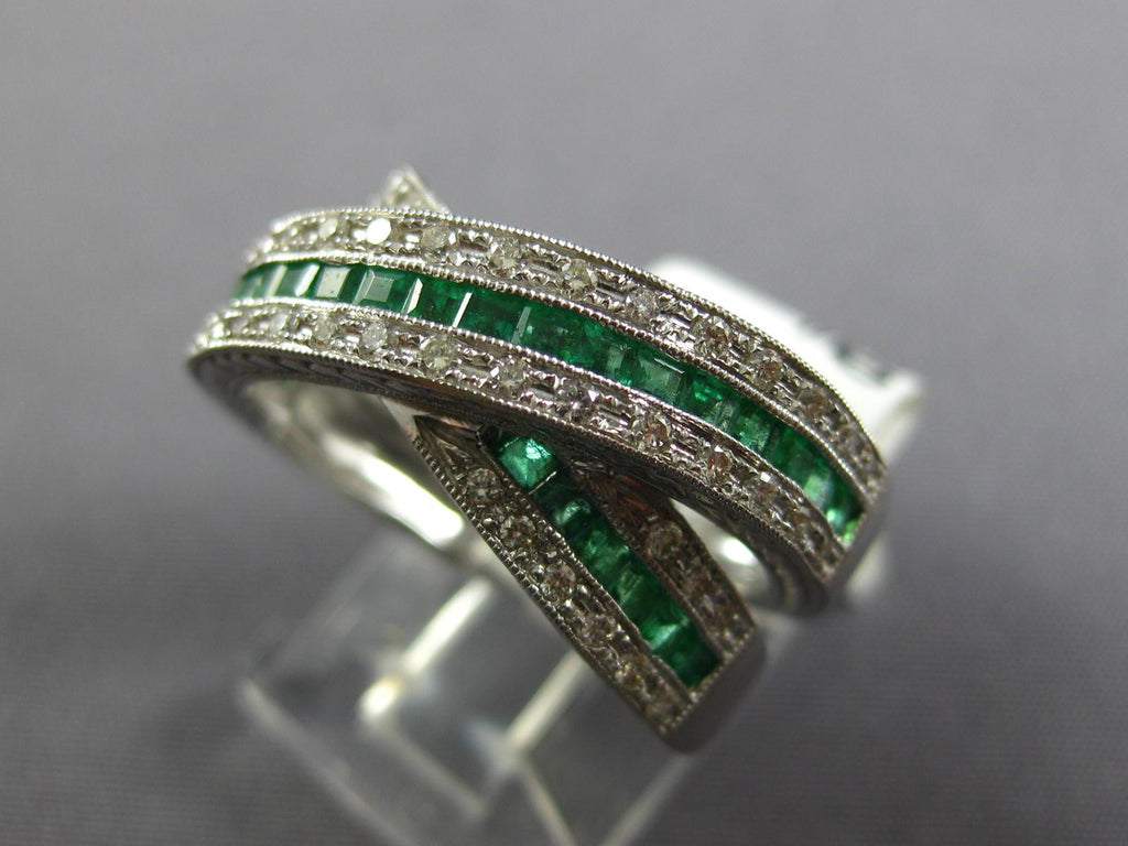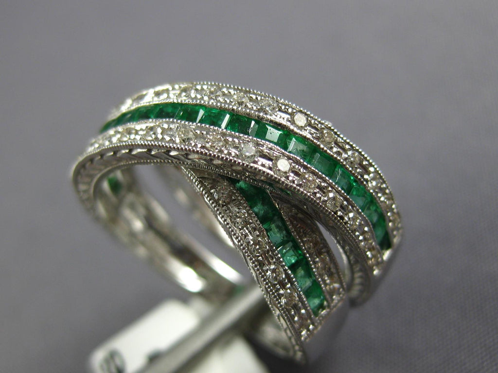 14KT WHITE GOLD FUN RING. 3D CRISS CROSS INFINITY MULTI ROW DESIGN. DIAMONDS ARE F/G COLOR, VSSI CLARITY .52 CARATS. AAA EMERALDS ARE 1.08 CARATS. MEASURES 6mm WIDE. RING SIZE 6.5. CAN BE SIZED BY OUR MASTER JEWELER UPON REQUEST. WRITTEN APPRAISAL AVAILABLE. COMES IN A PRESENTABLE GIFT BOX.
