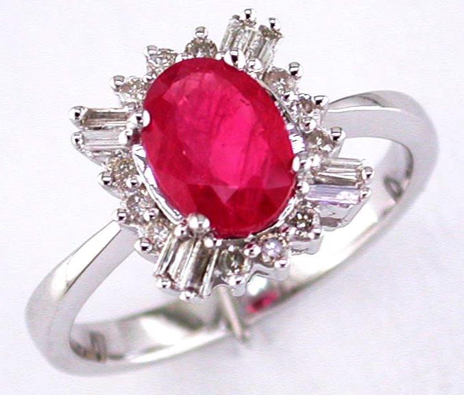 14KT WHITE GOLD FUN RING. 3D FLOWER DESIGN. ROUND AND BAGUETTE DIAMONDS ARE F/G COLOR, VSSI CLARITY .25 CARATS. AAA OVAL RUBY IS 1.35 CARATS. RING SIZE 7. CAN BE SIZED BY OUR MASTER JEWELER UPON REQUEST. WRITTEN APPRAISAL AVAILABLE. COMES IN A PRESENTABLE GIFT BOX.
