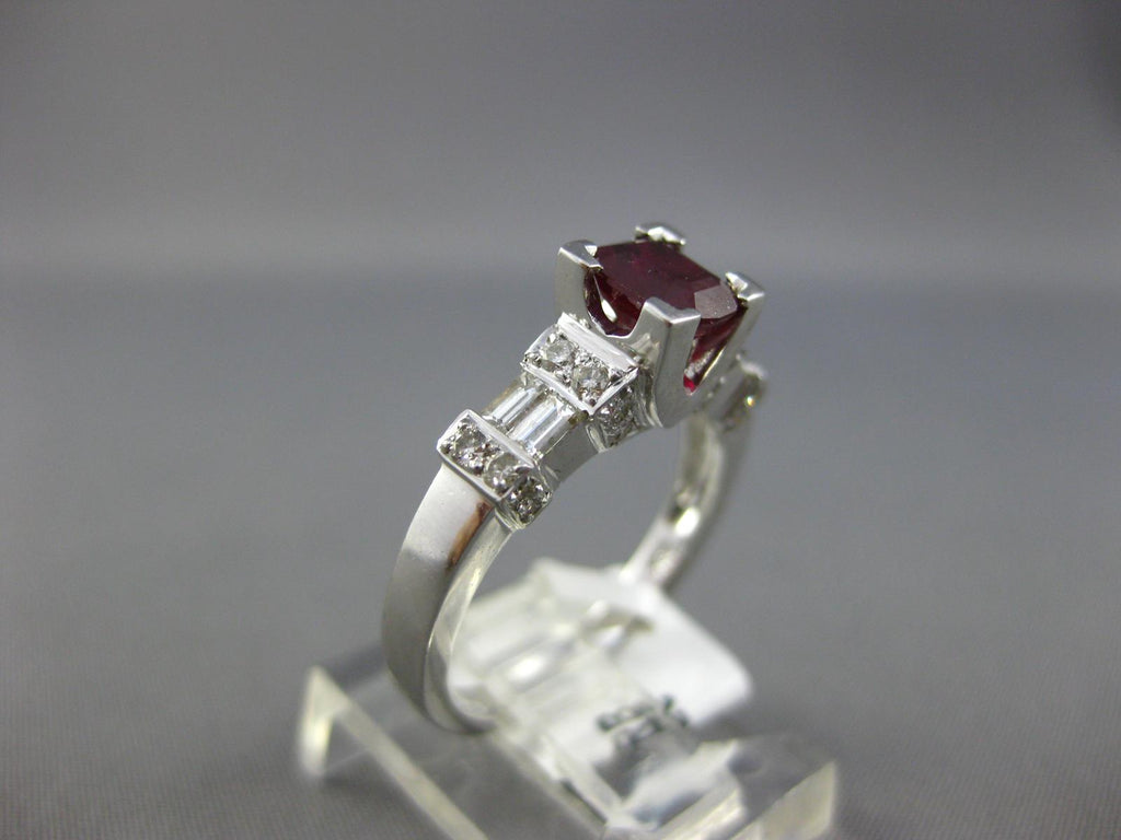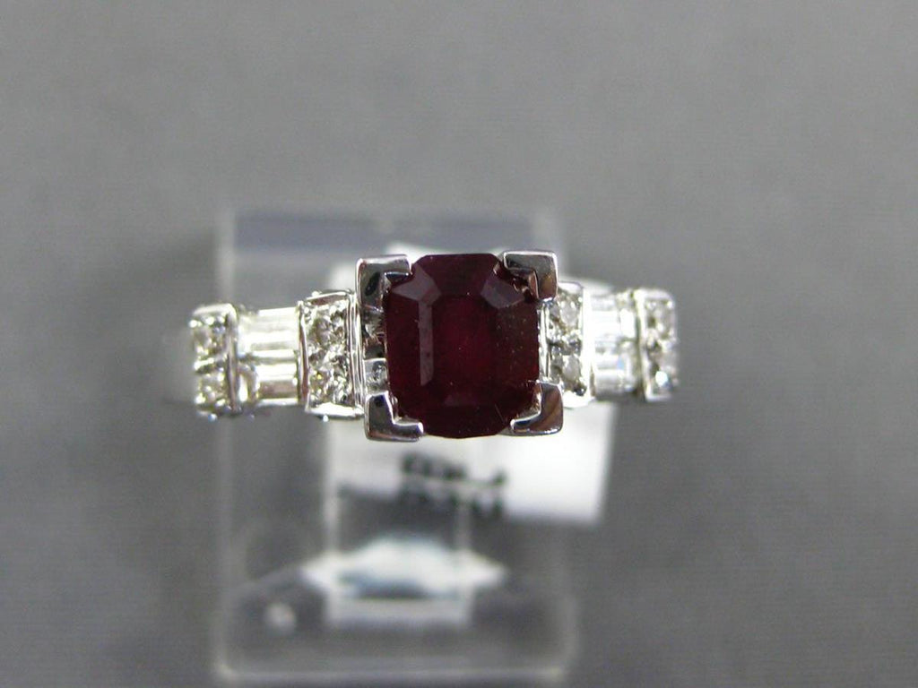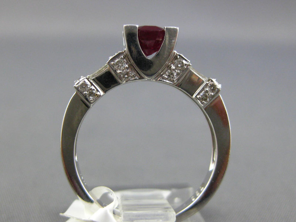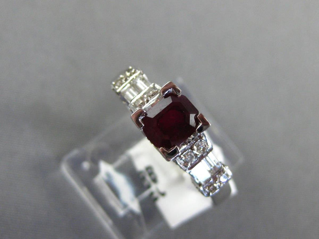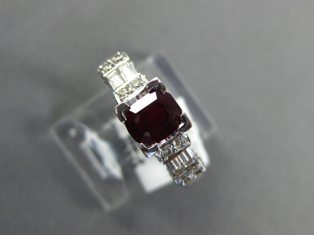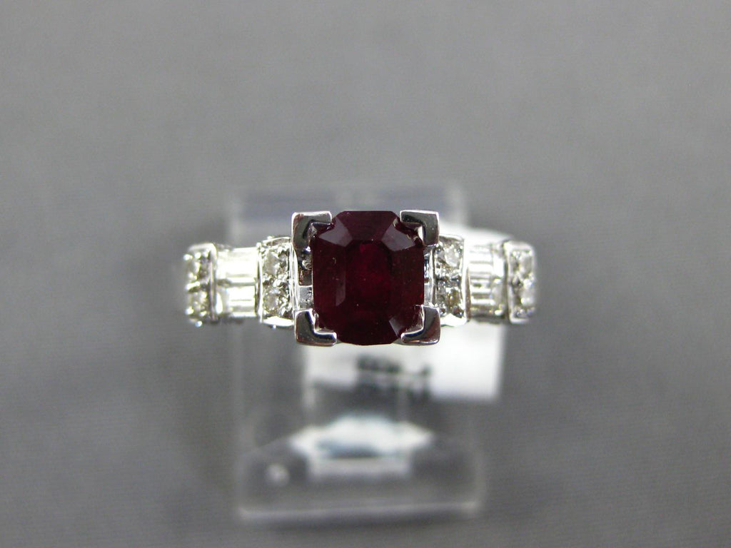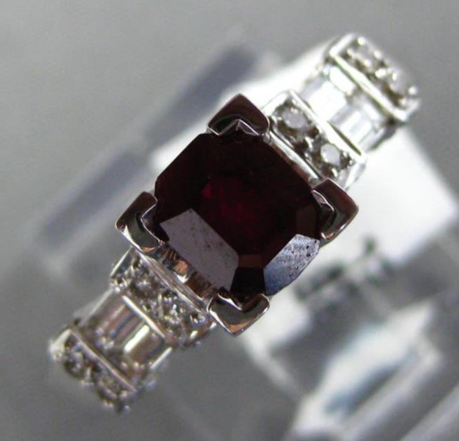 14KT WHITE GOLD ENGAGEMENT RING. 3D CLASSIC DESIGN. ROUND DIAMONDS ARE F/G COLOR, VSSI CLARITY .65 CARATS. AAA EMERALD CUT RUBY IS .96 CARATS. MEASURES 6mm WIDE. RING SIZE 6.5. CAN BE SIZED BY OUR MASTER JEWELER UPON REQUEST. WRITTEN APPRAISAL AVAILABLE. COMES IN A PRESENTABLE GIFT BOX.