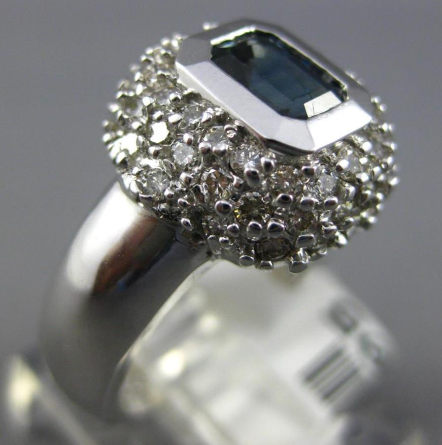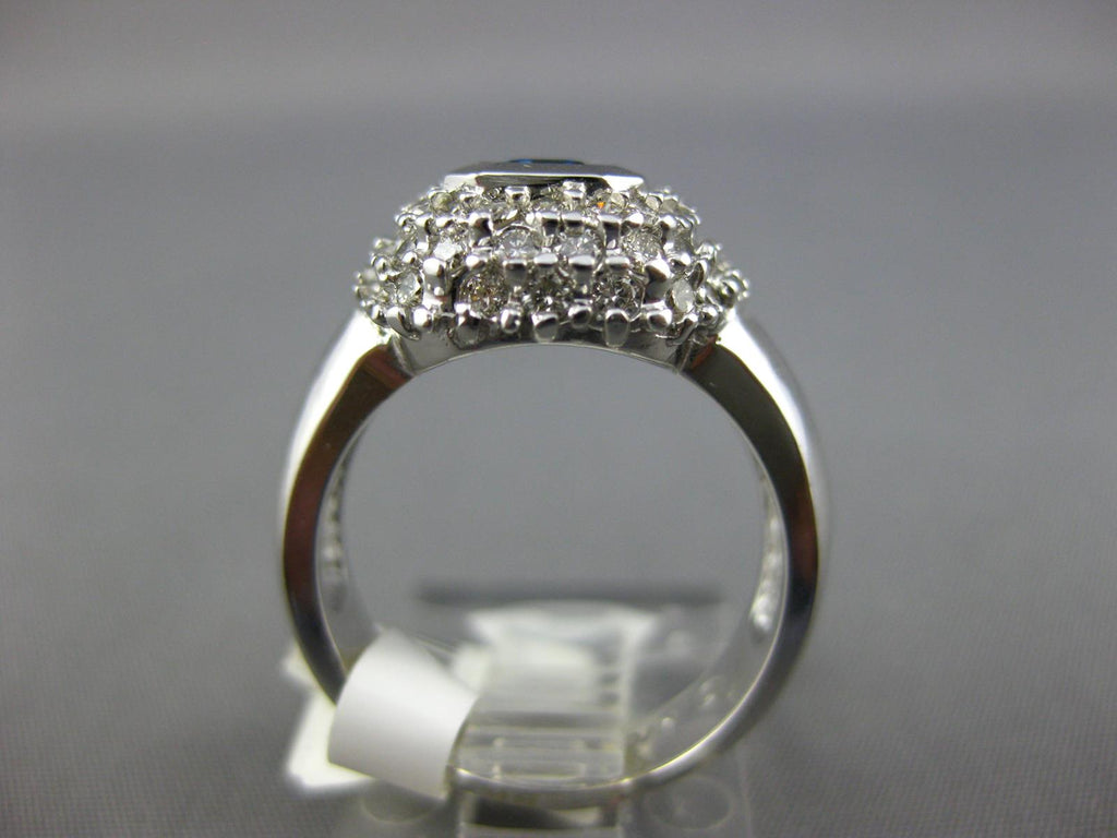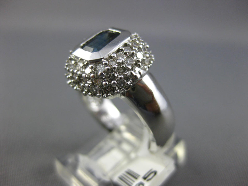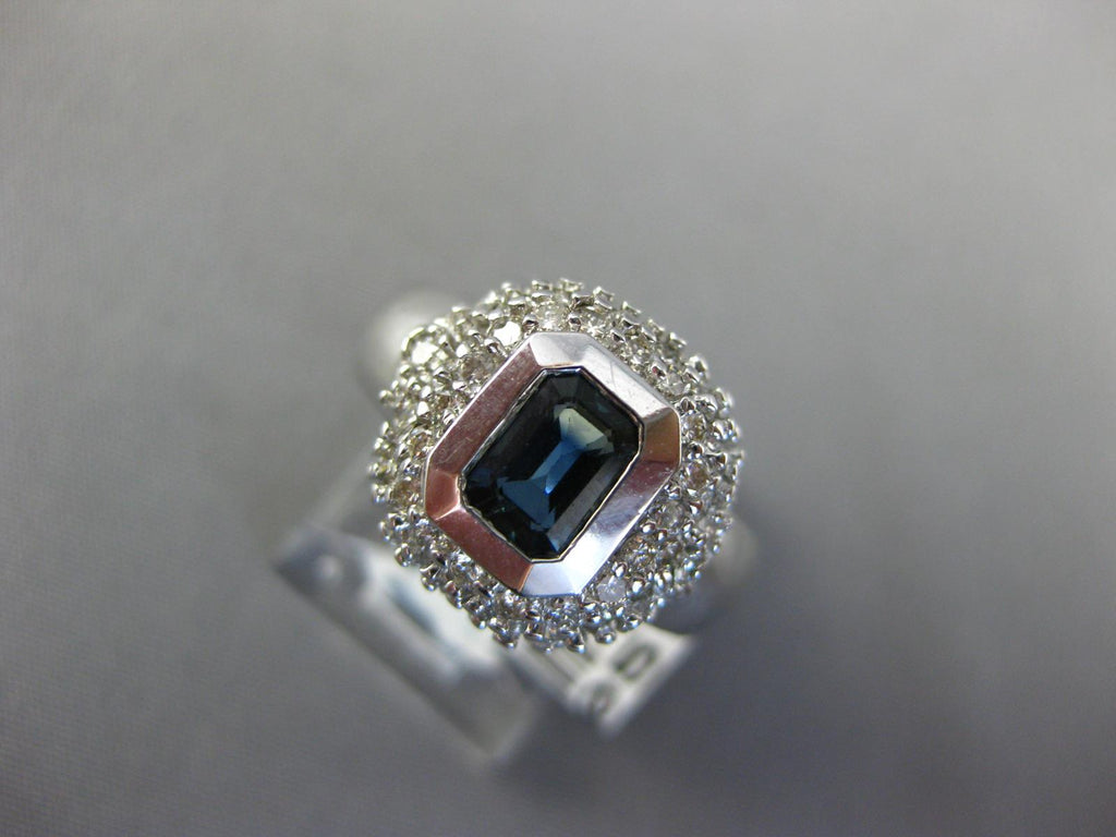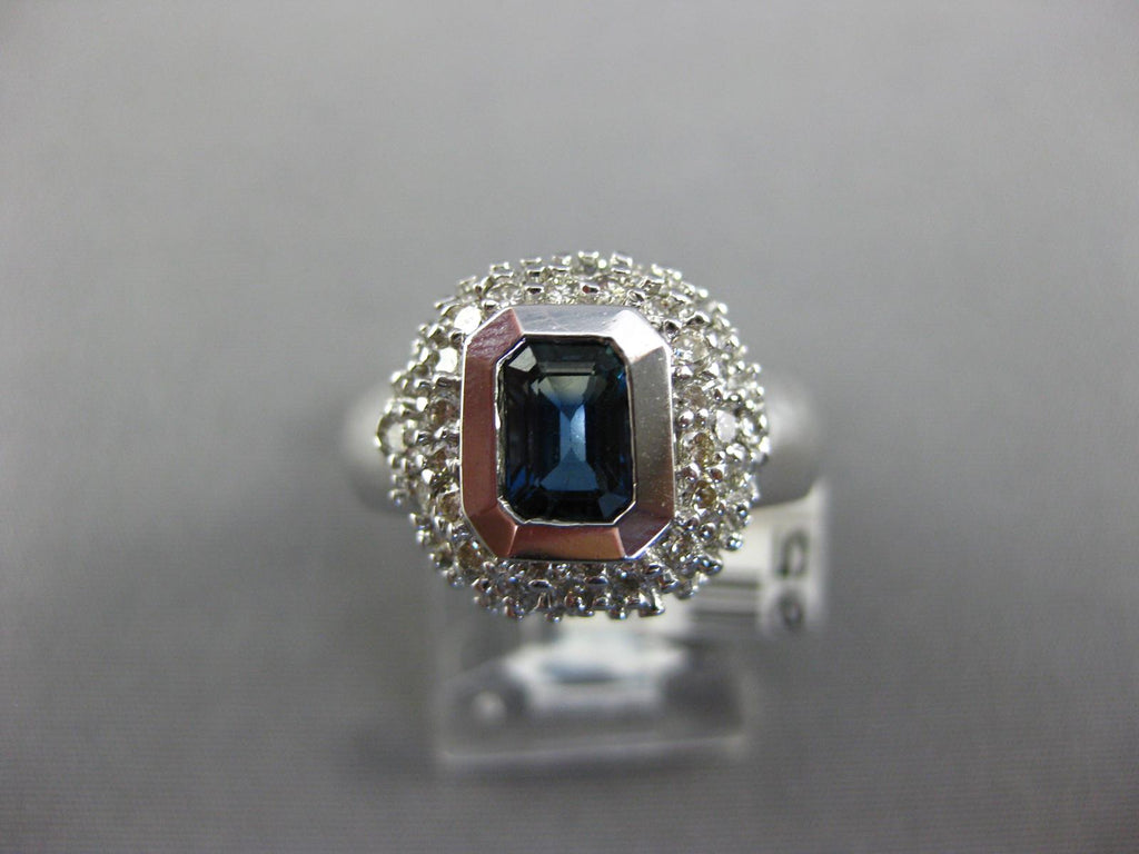 14KT WHITE GOLD FUN RING. 3D BEZEL DESIGN. ROUND DIAMONDS ARE F/G COLOR, VSSI CLARITY .70 CARATS. AAA EMERALD CUT SAPPHIRE IS .96 CARATS. MEASURES 13mm WIDE. RING SIZE 6.5. CAN BE SIZED BY OUR MASTER JEWELER UPON REQUEST. WRITTEN APPRAISAL AVAILABLE. COMES IN A PRESENTABLE GIFT BOX.