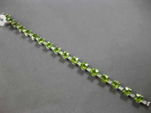 14KT WHITE GOLD TENNIS BRACELET. 3D CLASSIC FILIGREE DESIGN. ROUND DIAMONDS ARE F/G COLOR, VSSI CLARITY .11 CARATS. AAA EXTRA FACETED CUSHION CUT PERIDOTS ARE 17.35 CARATS. MEASURES 6mm WIDE. 7" INCHES LONG. WRITTEN APPRAISAL AVAILABLE. COMES IN A PRESENTABLE GIFT BOX.