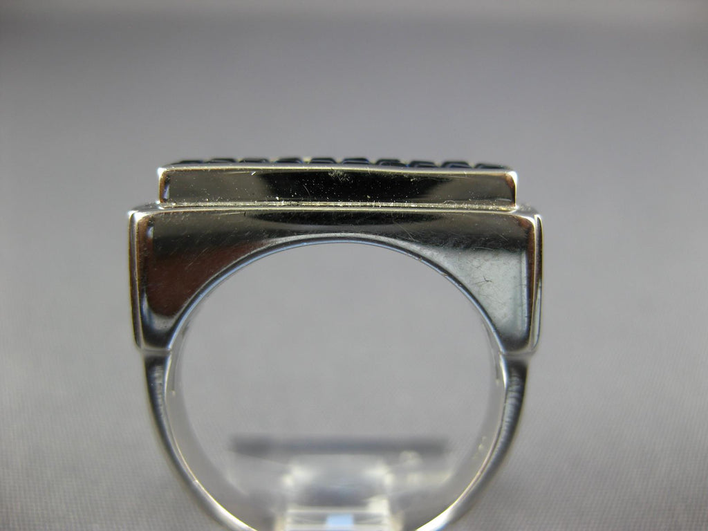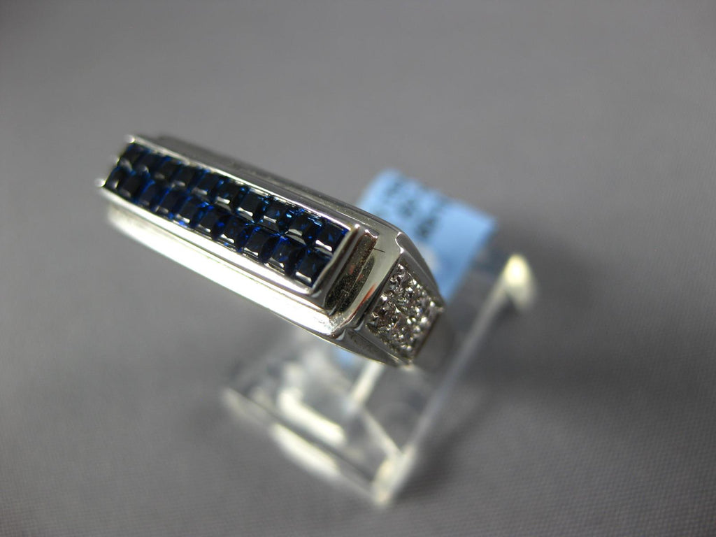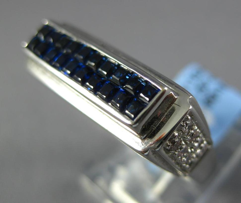 18KT WHITE GOLD FUN RING. 3D INVISIBLE RECTANGULAR DESIGN. ROUND DIAMONDS ARE F/G COLOR, VS CLARITY .16 CARATS. AAA PRINCESS CUT SAPPHIRES ARE 1.57 CARATS. MEASURES 7mm WIDE. RING SIZE 7.75. CAN BE SIZED BY OUR MASTER JEWELER UPON REQUEST. WRITTEN APPRAISAL AVAILABLE. COMES IN A PRESENTABLE GIFT BOX.