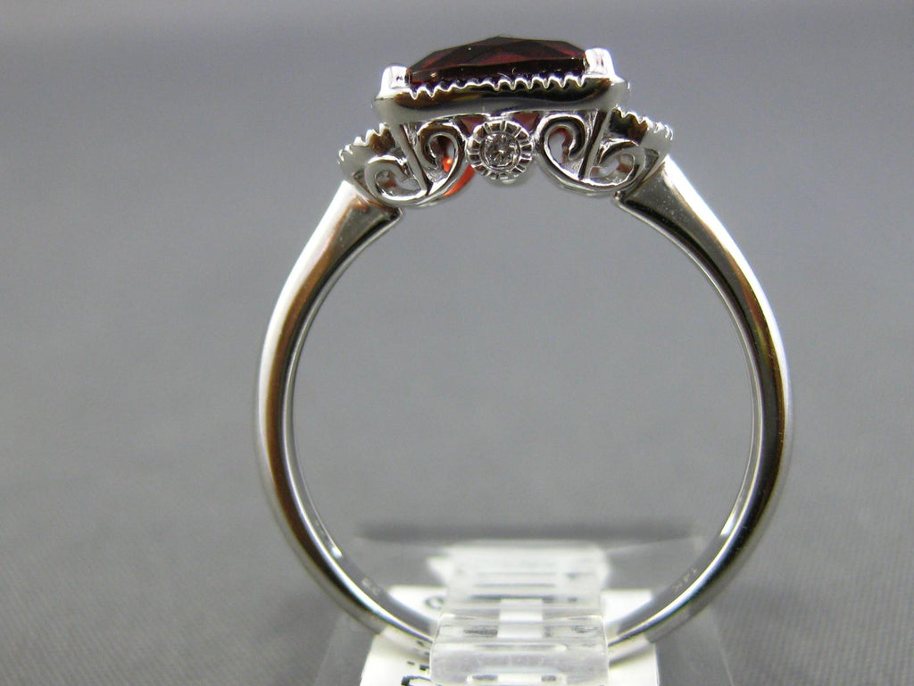14KT WHITE GOLD FUN RING. 3D SQUARE FILIGREE DESIGN. ROUND DIAMONDS ARE F/G COLOR, VSSI CLARITY .05 CARATS. AAA EXTRA FACETED CUSHION CUT GARNET IS 1.71 CARATS. MEASURES 7mm WIDE. RING SIZE 7. CAN BE SIZED BY OUR MASTER JEWELER UPON REQUEST. WRITTEN APPRAISAL AVAILABLE. COMES IN A PRESENTABLE GIFT BOX.