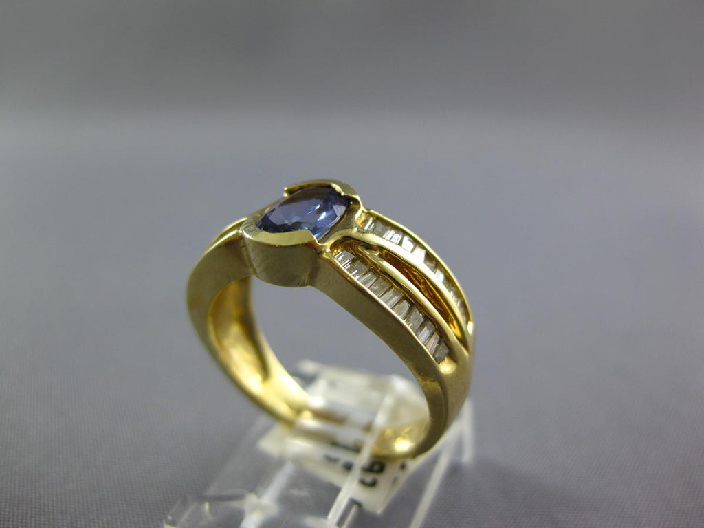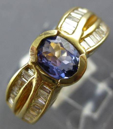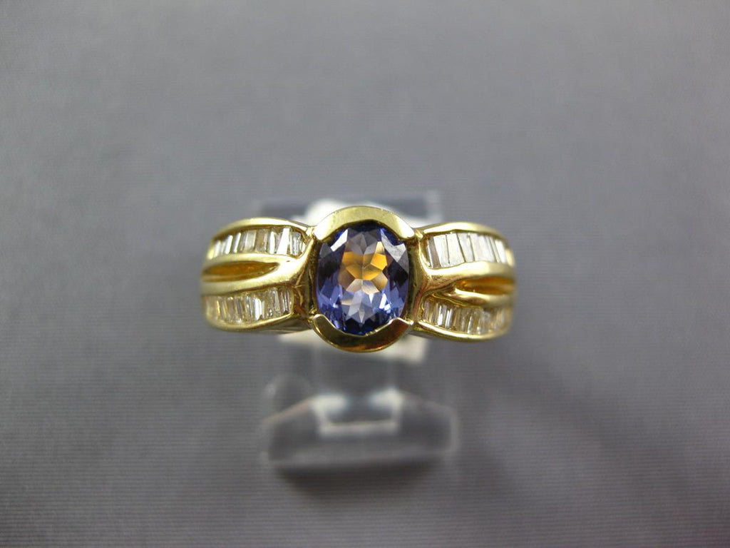 14KT YELLOW GOLD ENGAGEMENT RING. 3D SEMI BEZEL DESIGN. BAGUETTE DIAMONDS ARE F/G COLOR, VSSSI CLARITY .93 CARATS. AAA OVAL TANZANITE IS .85 CARATS. MEASURES 8mm WIDE. RING SIZE 6.25. CAN BE SIZED BY OUR MASTER JEWELER UPON REQUEST. WRITTEN APPRAISAL AVAILABLE. COMES IN A PRESENTABLE GIFT BOX.