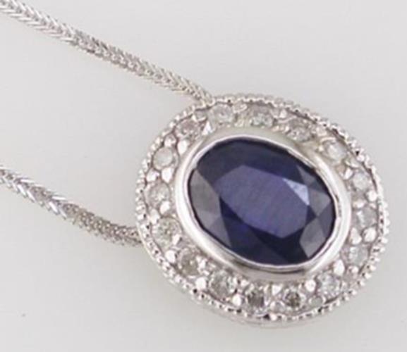 14KT WHITE GOLD FLOATING PENDANT. 3D CLASSIC HALO FILIGREE MILGRAIN DESIGN. ROUND DIAMONDS ARE F/G COLOR, VSSI CLARITY .25 CARATS. AAA OVAL SAPPHIRE IS 1.55 CARATS. COMES ON A 14KT GOLD DIAMOND CUT 18" INCH CHAIN. WRITTEN APPRAISAL AVAILABLE. COMES IN A PRESENTABLE GIFT BOX.