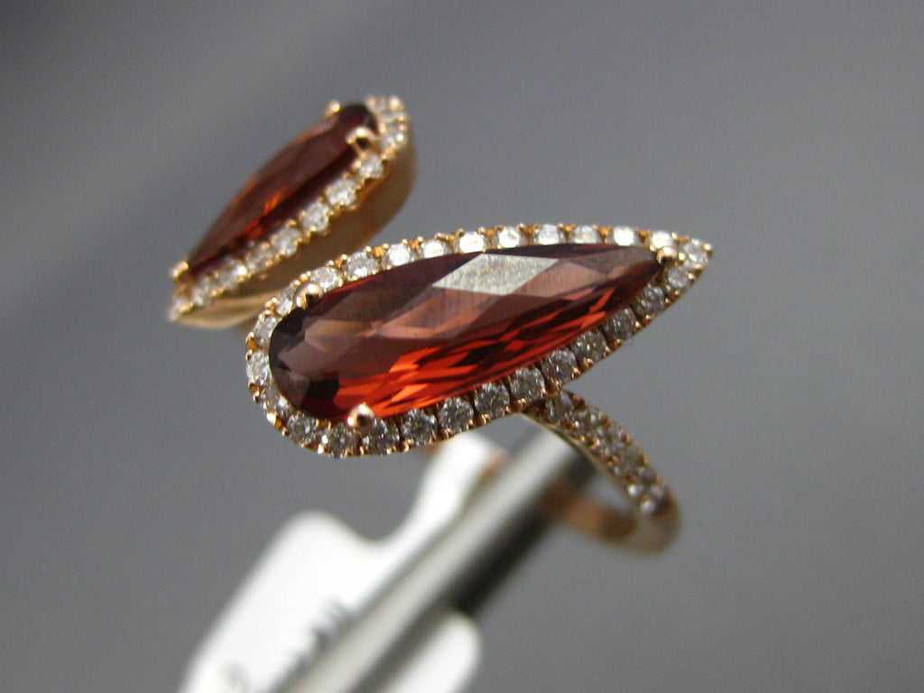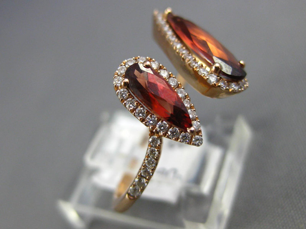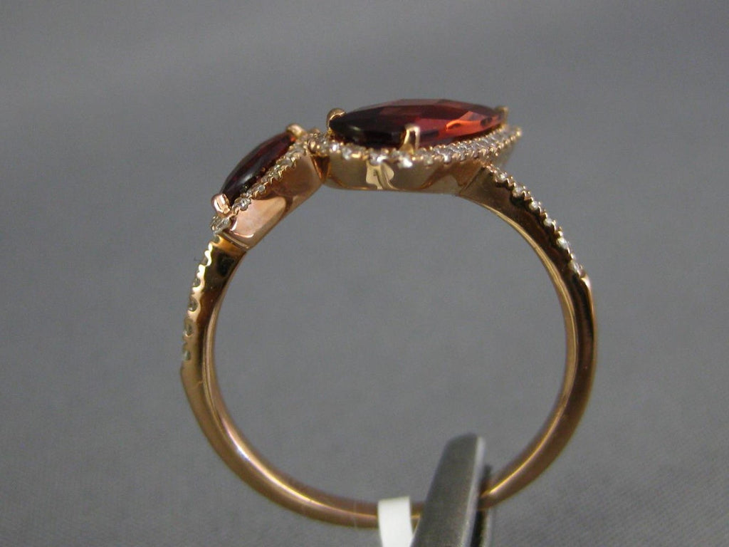 14KT ROSE GOLD LOVE RING. 3D CRISS CROSS DESIGN. ROUND DIAMONDS ARE F/G COLOR, VSSI CLARITY .32 CARATS. AAA EXTRA FACETED PEAR SHAPE GARNETS ARE 1.50 CARATS. MEASURES 14mm WIDE. RING SIZE 7. CAN BE SIZED BY OUR MASTER JEWELER UPON REQUEST. WRITTEN APPRAISAL AVAILABLE. COMES IN A PRESENTABLE GIFT BOX.