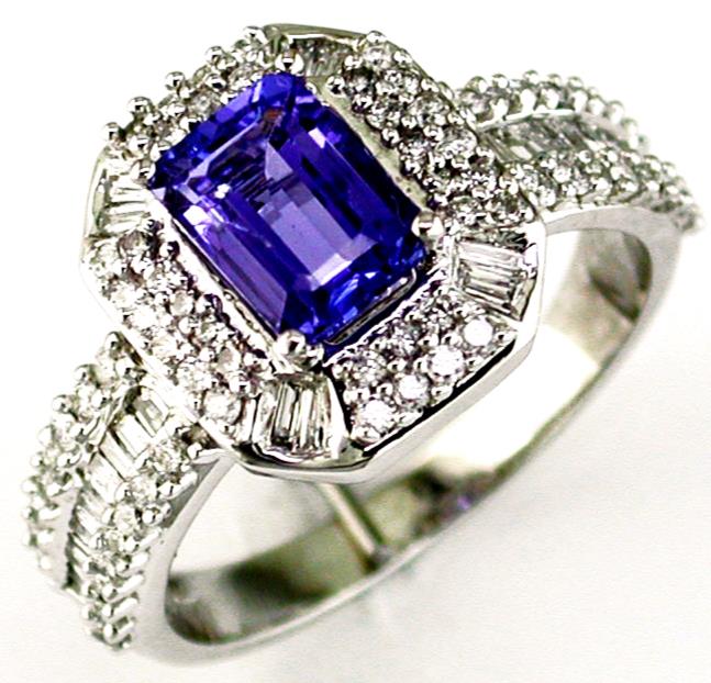 14KT WHITE GOLD ENGAGEMENT RING. 3D DOUBLE HALO OCTAGON DESIGN. ROUND DIAMONDS ARE F/G COLOR, VSSI CLARITY .78 CARATS. AAA EMERALD CUT TANZANITE IS 1.05 CARATS. RING SIZE 7. CAN BE SIZED BY OUR MASTER JEWELER UPON REQUEST. WRITTEN APPRAISAL AVAILABLE. COMES IN A PRESENTABLE GIFT BOX.
