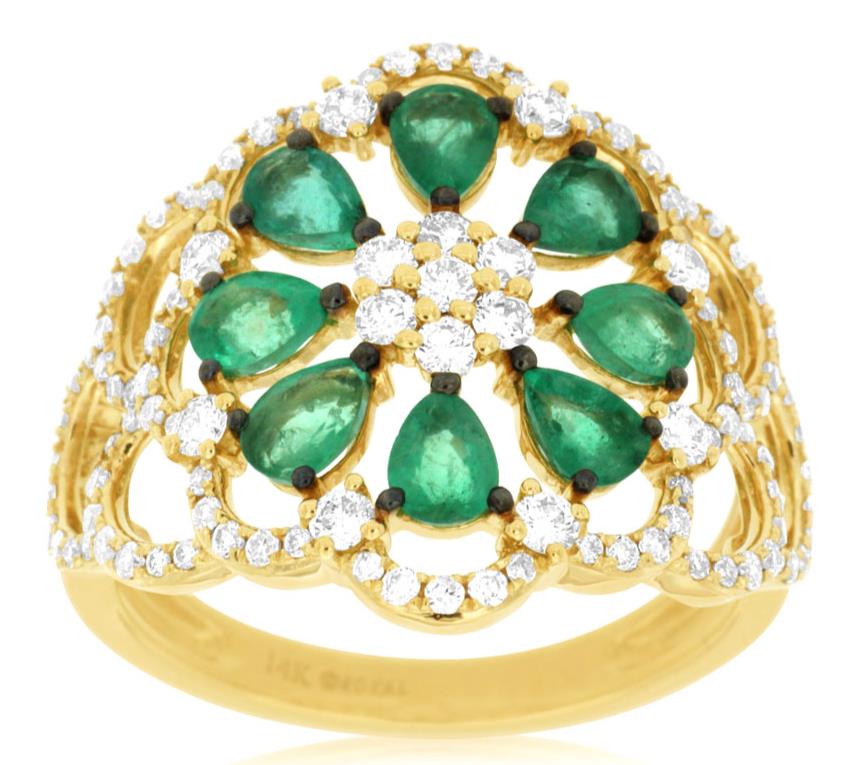 14KT YELLOW GOLD FUN RING. 3D OPEN FILIGREE FLOWER DESIGN. ROUND DIAMONDS ARE F/G COLOR, VSSI CLARITY .75 CARATS. AAA PEAR SHAPE EMERALDS ARE 1.10 CARATS. RING SIZE 7. CAN BE SIZED BY OUR MASTER JEWELER UPON REQUEST. WRITTEN APPRAISAL AVAILABLE. COMES IN A PRESENTABLE GIFT BOX.