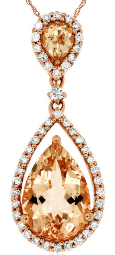 14KT ROSE GOLD FLOATING PENDANT. 3D CLASSIC TEAR DROP DESIGN. ROUND DIAMONDS ARE F/G COLOR, VSSI CLARITY .25 CARATS. AAA PEAR SHAPE MORGANITES ARE 1.60 CARATS. COMES ON A 14KT GOLD DIAMOND CUT 16" INCH CHAIN. WRITTEN APPRAISAL AVAILABLE. COMES IN A PRESENTABLE GIFT BOX.
