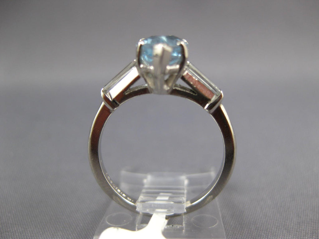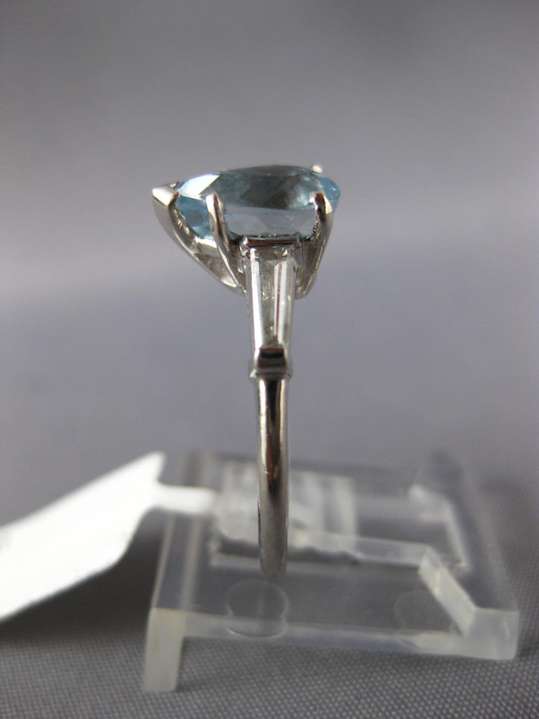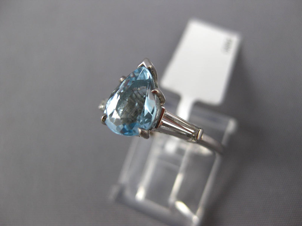PLATINUM ENGAGEMENT RING. 3D CLASSIC DESIGN. BAGUETTE DIAMONDS ARE F/G COLOR, VSSI CLARITY .10 CARATS. AAA PEAR SHAPE AQUAMARINE IS 1.80 CARATS. MEASURES 95mm WIDE. RING SIZE 5. CAN BE SIZED BY OUR MASTER JEWELER UPON REQUEST. WRITTEN APPRAISAL AVAILABLE. COMES IN A PRESENTABLE GIFT BOX.