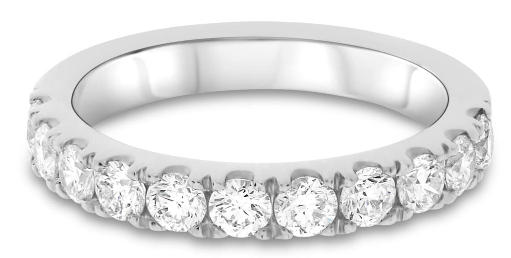 14KT WHITE GOLD WEDDING ANNIVERSARY RING. 3D CLASSIC FOUR PRONG SEMI ETERNITY DESIGN. ROUND DIAMONDS ARE F/G COLOR, VSSI CLARITY 1.0 CARAT. MEASURES 3.1mm WIDE. RING SIZE 6.5. CAN BE SIZED BY OUR MASTER JEWELER UPON REQUEST. WRITTEN APPRAISAL AVAILABLE. COMES IN A PRESENTABLE GIFT BOX.