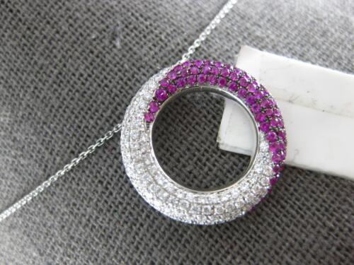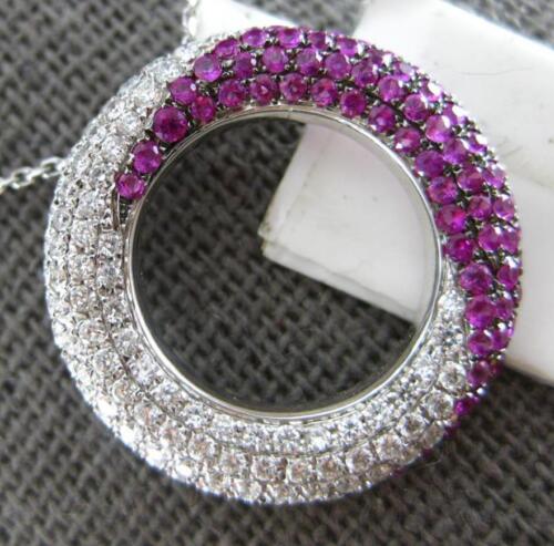 14KT WHITE GOLD FLOATING PENDANT. 3D MULTI ROW CIRCLE OF LIFE DESIGN. DIAMONDS ARE F/G COLOR, VSSI CLARITY .55 CARATS. AAA PINK SAPPHIRES ARE .45 CARATS. MEASURES 19.5mm WIDE. COMES ON A 14KT GOLD DIAMOND CUT 16" INCH CHAIN. WRITTEN APPRAISAL AVAILABLE. COMES IN A PRESENTABLE GIFT BOX.