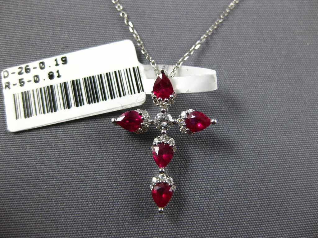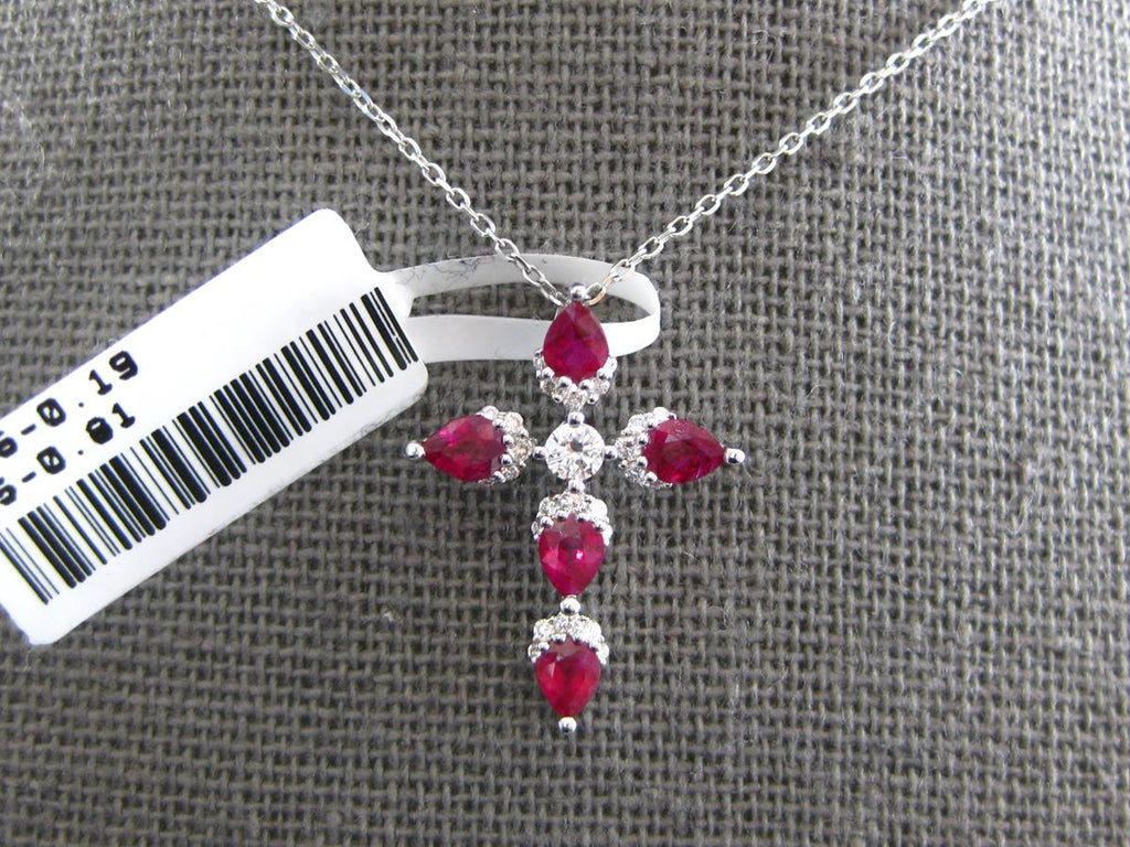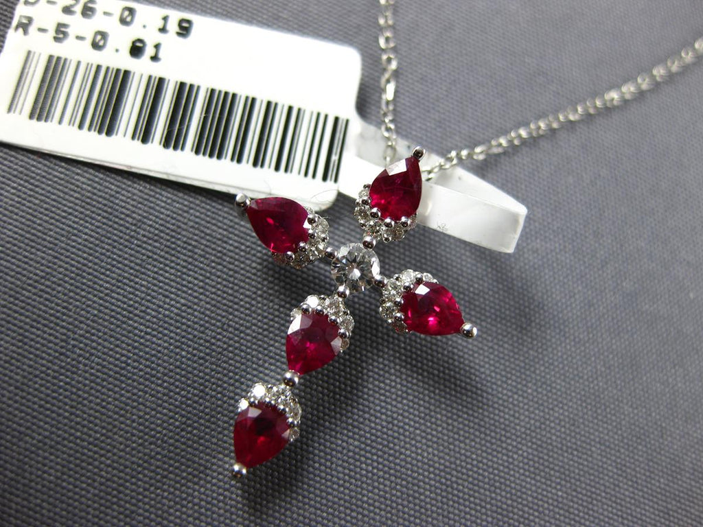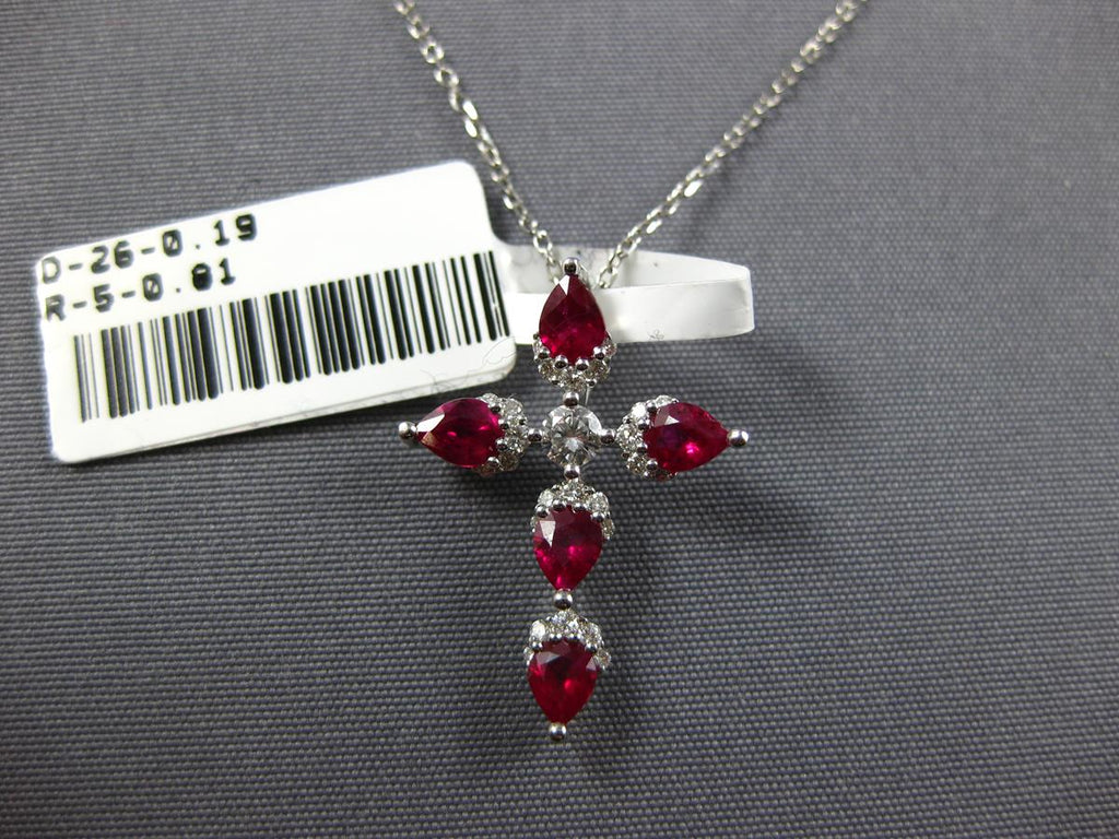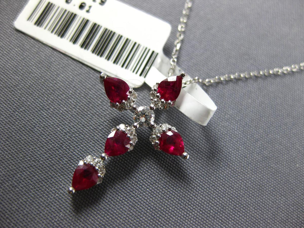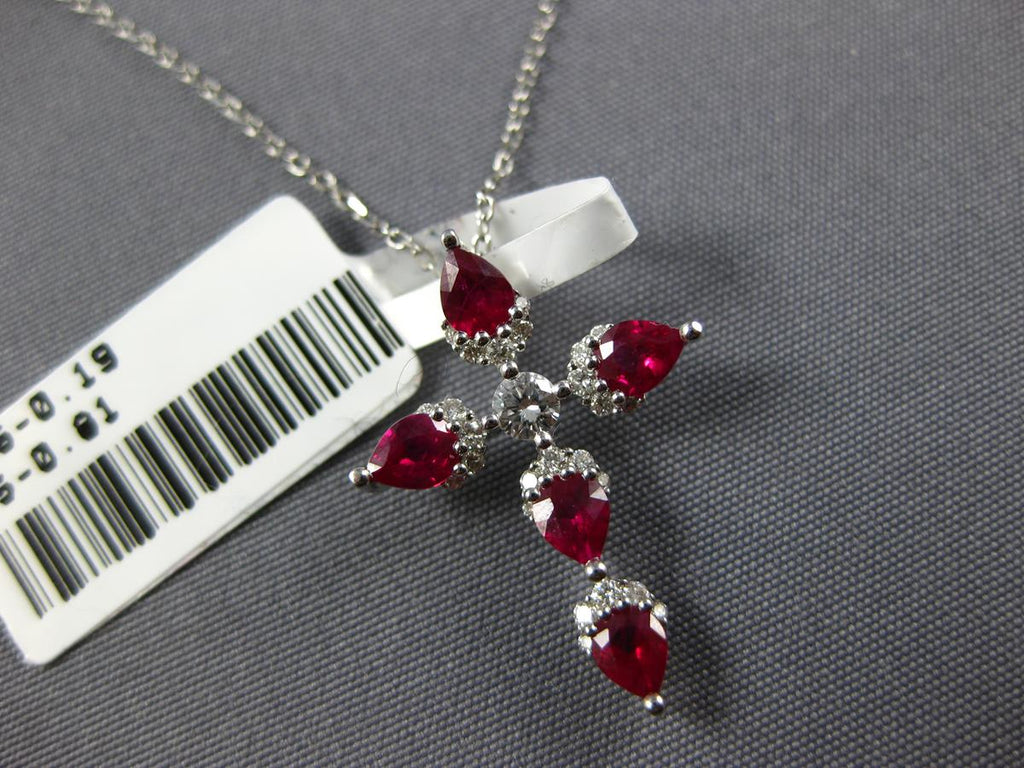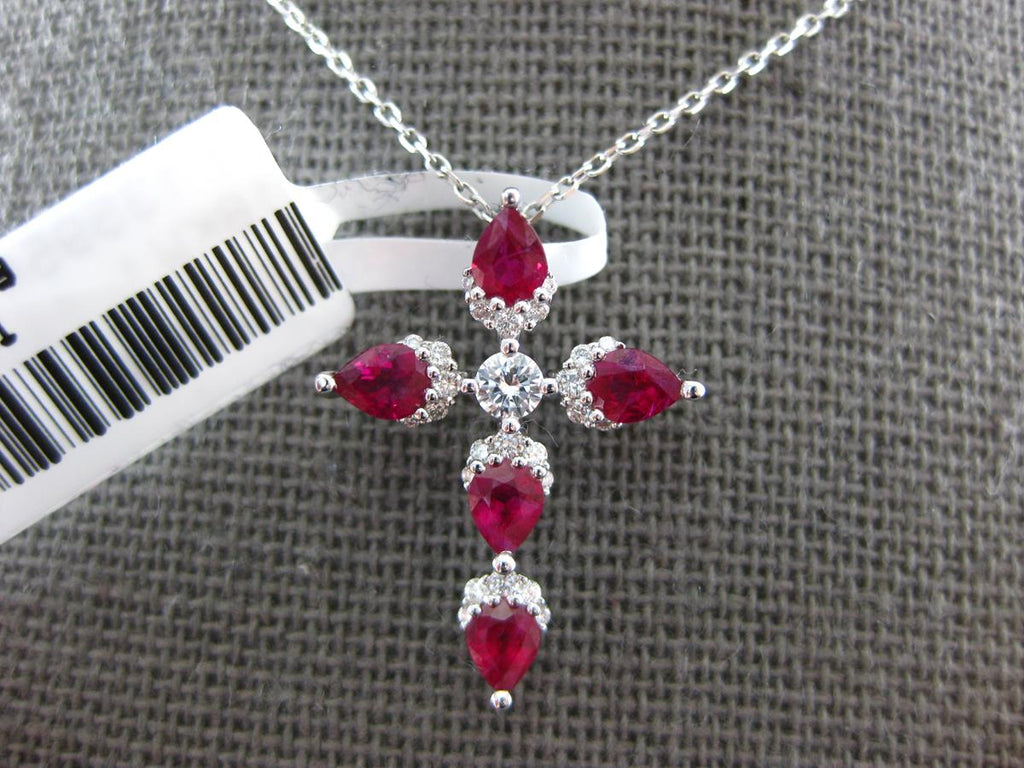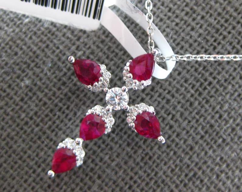 18KT WHITE GOLD FLOATING PENDANT. 3D CROSS DESIGN. ROUND DIAMONDS ARE F/G COLOR, VSSI CLARITY .19 CARATS. AAA PEAR SHAPE RUBIES ARE .81 CARATS. MEASURES 21mm X 15mm. COMES ON A 14KT GOLD DIAMOND CUT 16" INCH CHAIN. WRITTEN APPRAISAL AVAILABLE. COMES IN A PRESENTABLE GIFT BOX.