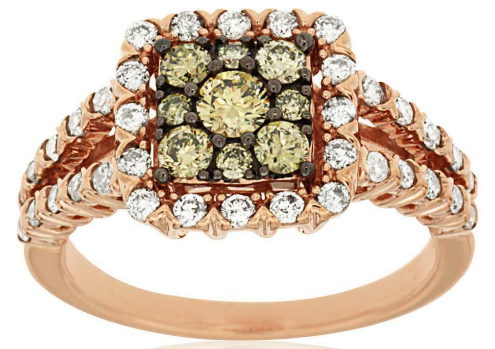 14KT ROSE GOLD LOVE RING. 3D CLUSTER SQUARE HALO DESIGN. WHITE DIAMONDS ARE F/G COLOR, VSSI CLARITY .54 CARATS. CHOCOLATE FANCY DIAMONDS ARE .46 CARATS. RING SIZE 7. CAN BE SIZED BY OUR MASTER JEWELER UPON REQUEST. WRITTEN APPRAISAL AVAILABLE. COMES IN A PRESENTABLE GIFT BOX.