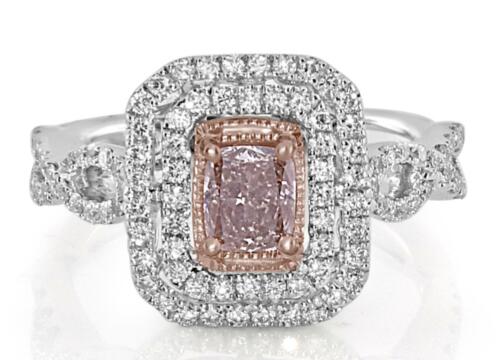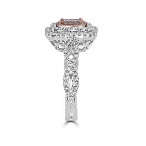 18KT WHITE AND ROSE GOLD ENGAGEMENT RING. 3D DOUBLE HALO SQUARE OCTAGON INFINITY DESIGN. ROUND WHITE DIMAONDS ARE F/G COLOR VSSI CLARITY .55 CARATS. CUSHION CUT PINK DIAMOND IS .45 CARATS. RING SIZE 6.5. CAN BE SIZED BY OUR MASTER JEWELER UPON REQUEST. WRITTEN APPRAISAL AVAILABLE. COMES IN A PRESENTABLE GIFT BOX.