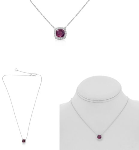 18KT WHITE GOLD LOVE NECKLACE. 3D CLASSIC SQUARE HALO DESIGN. ROUND DIAMONDS ARE F/G COLOR, VS CLARITY .15 CARATS. AAA CUSHION CUT RUBY IS 1.86 CARATS. 18" INCHES LONG. WRITTEN APPRAISAL AVAILABLE. COMES IN A PRESENTABLE GIFT BOX.