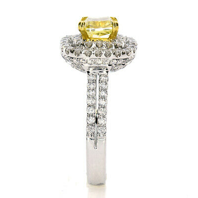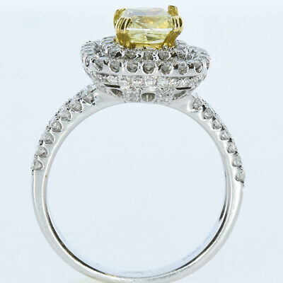 2.05CT WHITE & FANCY YELLOW DIAMOND 18KT 2 TONE GOLD DOUBLE HALO ENGAGEMENT RING
