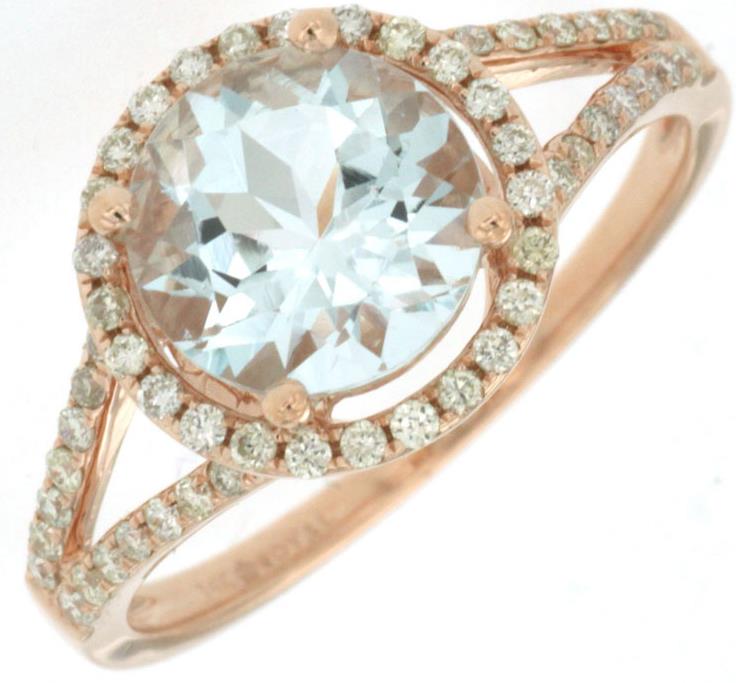 14KT ROSE GOLD ENGAGEMENT RING. 3D ROUND HALO CLASSICDESIGN. DIAMONDS ARE F/G COLOR, VSSI CLARITY 0.31 CARATS. AAA EXTRA FACETEDAQUAMARINE IS 1.75 CARATS.RING SIZE 7. CAN BE SIZED BY OUR MASTER JEWELER UPON REQUEST. WRITTEN APPRAISAL AVAILABLE. COMES IN A PRESENTABLE GIFT BOX.
