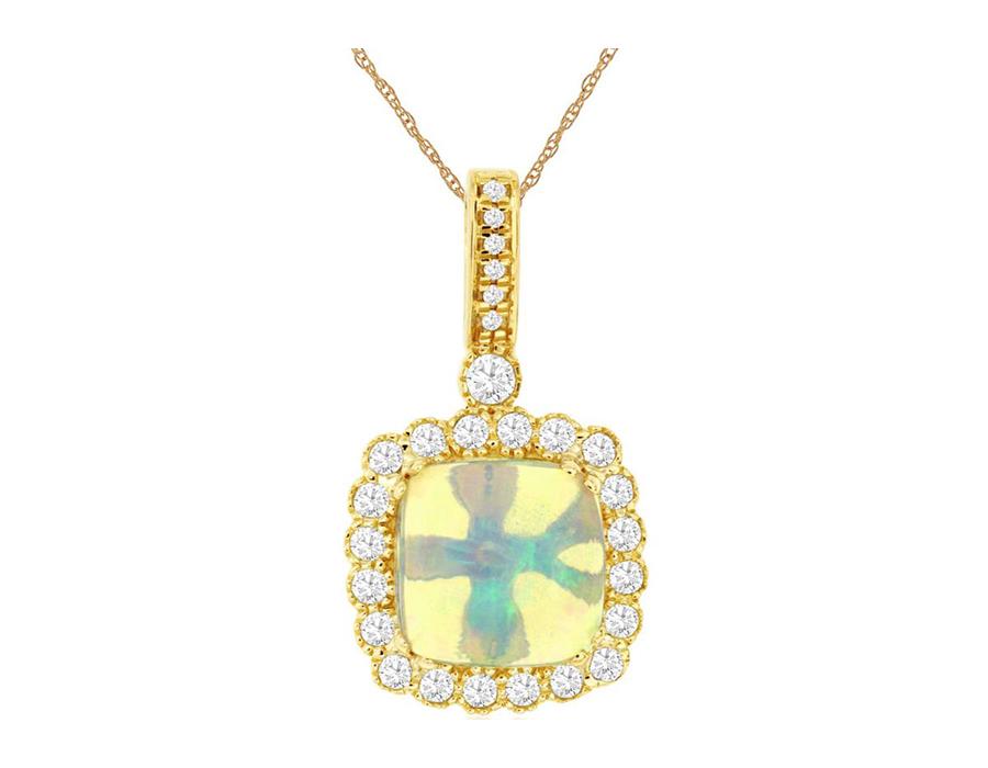 14KT YELLOW GOLD FLOATING PENDANT. 3D SQUARE FILIGREE HALO CLASSIC DESIGN. ROUND DIAMONDS ARE F/G COLOR, VSSI CLARITY .37 CARATS. AAA CUSHION CUT OPAL IS 1.70 CARATS. COMES ON A 14KT GOLD DIAMOND CUT 18" INCH CHAIN. WRITTEN APPRAISAL AVAILABLE. COMES IN A PRESENTABLE GIFT BOX.