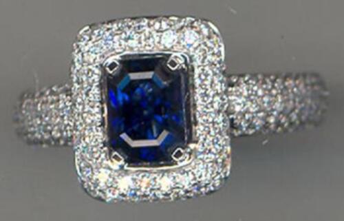 18KT WHITE GOLD ENGAGEMENT RING. 3D HALO DESIGN. ROUND DIAMONDS ARE F/G COLOR, VSSI CLARITY .71 CARATS. AAA EMERALD CUT SAPPHIRE IS 1.36 CARATS. RING SIZE 7. CAN BE SIZED BY OUR MASTER JEWELER UPON REQUEST. WRITTEN APPRAISAL AVAILABLE. COMES IN A PRESENTABLE GIFT BOX.