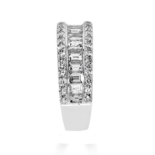 18KT WHITE GOLD ANNIVERSARY RING. 3D THREE ROW CLASSIC SEMI ETERNITY DESIGN. DIAMONDS ARE F/G COLOR, VSSI CLARITY. ROUND DIAMONDS ARE .71 CARATS. BAGUETTE DIAMONDS ARE 1.38 CARATS. RING SIZE 7. CAN BE SIZED BY OUR MASTER JEWELER UPON REQUEST. WRITTEN APPRAISAL AVAILABLE. COMES IN A PRESENTABLE GIFT BOX.