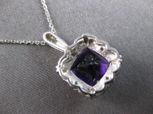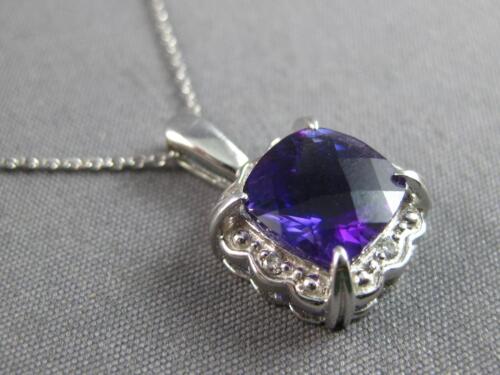 14KT WHITE GOLD FLOATING PENDANT. 3D SQUARE DESIGN. ROUND DIAMONDS ARE F/G COLOR, VSSI CLARITY .04 CARATS. AAA EXTRA FACETED CUSHION CUT AMETHYST IS 2.05 CARATS. MEASURES 17.5mm X 11mm. COMES ON A 14KT GOLD DIAMOND CUT 16" INCH CHAIN. WRITTEN APPRAISAL AVAILABLE. COMES IN A PRESENTABLE GIFT BOX.