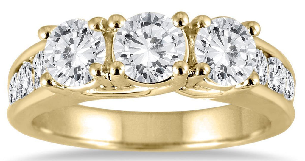 14KT YELLOW GOLD LOVE RING. 3D CLASSIC THREE STONE LUCIDA PAST PRESENT FUTURE DESIGN. ROUND DIAMONDS ARE G/H COLOR, SI CLARITY 2.0 CARATS. RING SIZE 6.5. CAN BE SIZED BY OUR MASTER JEWELER UPON REQUEST. WRITTEN APPRAISAL AVAILABLE. COMES IN A PRESENTABLE GIFT BOX.