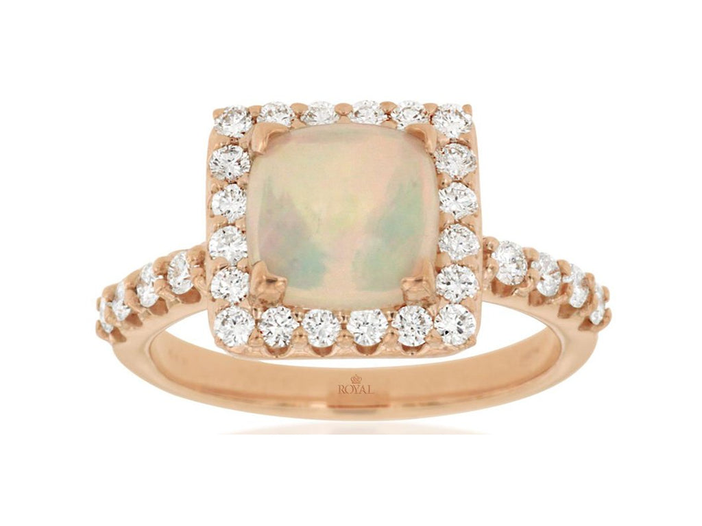 14KT ROSE GOLD ENGAGEMENT RING. 3D SQUARE HALO CLASSIC DESIGN. ROUND DIAMONDS ARE F/G COLOR, VSSI CLARITY .70 CARATS. AAA CUSHION CUT OPAL IS 1.40 CARATS. RING SIZE 7. CAN BE SIZED BY OUR MASTER JEWELER UPON REQUEST. WRITTEN APPRAISAL AVAILABLE. COMES IN A PRESENTABLE GIFT BOX.