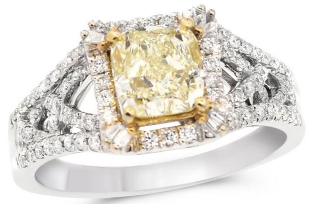 14KT WHITE AND YELLOW GOLD ENGAGEMENT RING. 3D FILIGREE INFINITY DESIGN. ROUND WHITE DIAMONDS ARE F/G COLOR, VSSI CLARITY .50 CARATS. CENTER CUSHION FANCY YELLOW DIAMOND IS 1.63 CARATS. RING SIZE 7. CAN BE SIZED BY OUR MASTER JEWELER UPON REQUEST. WRITTEN APPRAISAL AVAILABLE. COMES IN A PRESENTABLE GIFT BOX.